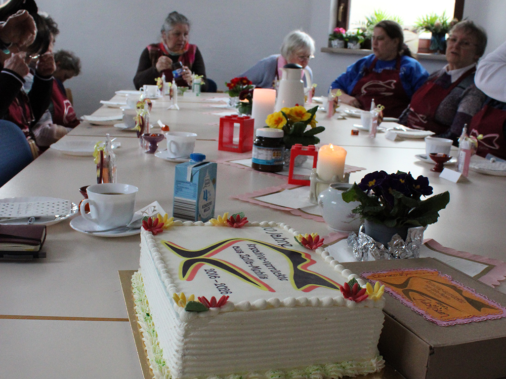 Zum Jubiläum waren alle Mitglieder gekommen – sogar eine Teilnehmerin aus der Schweiz ließ es sich nicht nehmen, dabei zu sein. Bei Kaffee, Gesprächen und einer Jubiläumstorte wurde gemeinsam auf zehn Jahre zurückgeblickt. Auch zahlreiche kreative Arbeiten aus der Vergangenheit waren ausgestellt und zeigten eindrucksvoll die Vielfalt und Entwicklung der Gruppe.