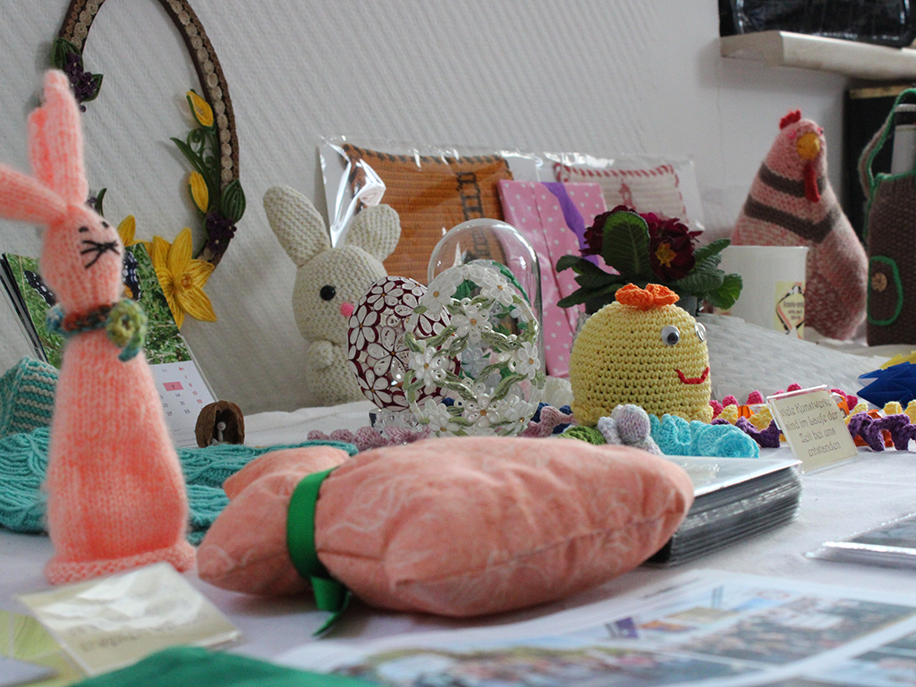 Doch die „Kreativ Verrückten“ sind nicht nur für sich aktiv. Regelmäßig präsentieren und verkaufen sie ihre Arbeiten auf Stadtfesten und Märkten. Darüber hinaus engagieren sie sich sozial: So schreiben sie beispielsweise Weihnachtskarten für Seniorinnen und Senioren in Pflegeeinrichtungen oder gestalten Osterschmuck für Brunnen in der Stadt.