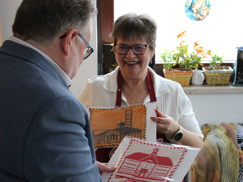 Als Zeichen der Wertschätzung überreichten die „Kreativ Verrückten“ dem Bürgermeister ein ganz besonderes Geschenk: liebevoll gehäkelte Topflappen mit Motiven des Rathauses und der Beschussanstalt.