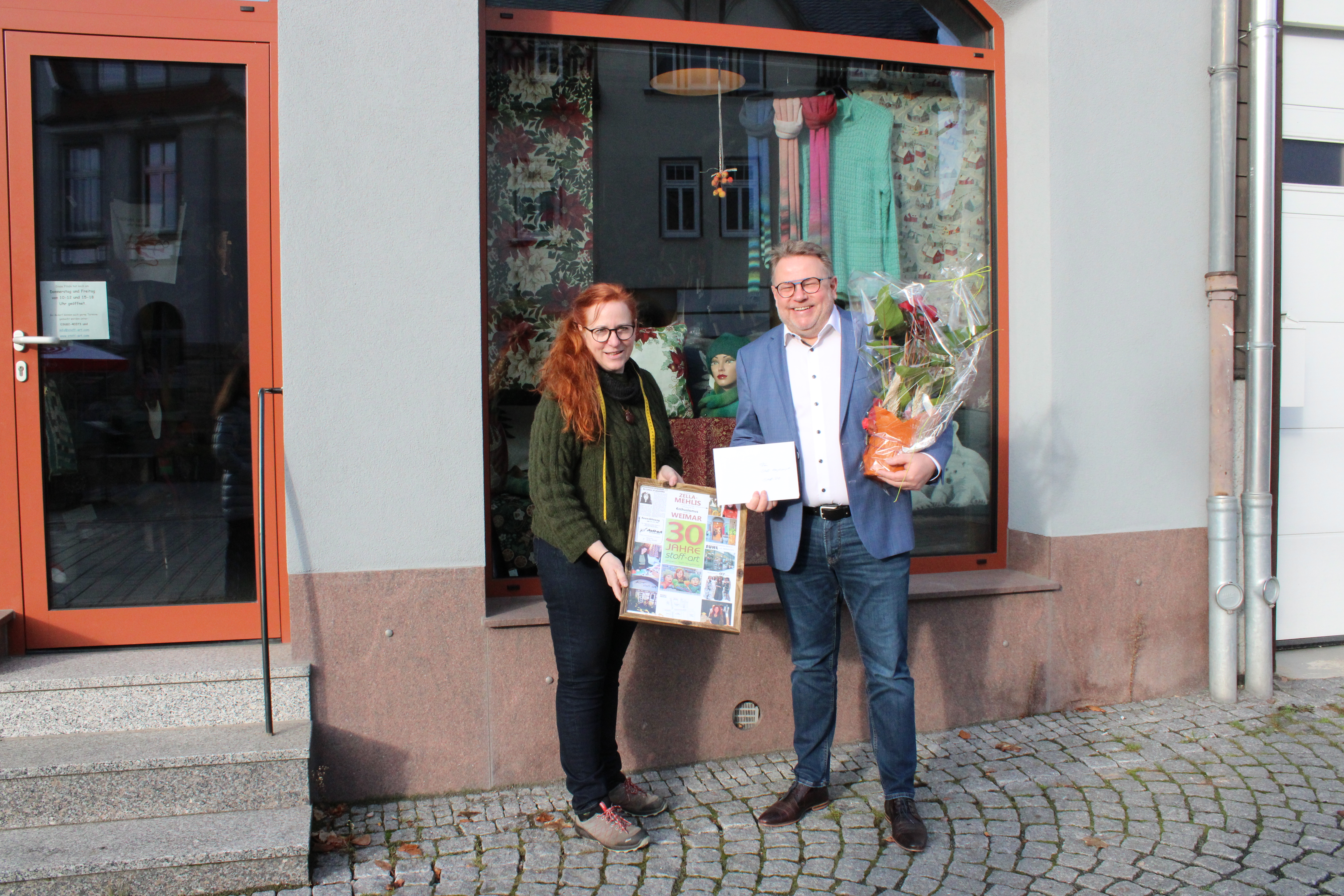 „Es begann in Zella-Mehlis mit einer Spinnerei … und ging mit viel Enthusiasmus weiter bis Weimar“ steht über einer Collage aus Fotos und Zeitungsausschnitten, die Steffi Hengelhaupt dieser Novembertage geschenkt bekommt. Und es ist nicht das einzige Geschenk. Auch eine Torte, dekoriert mit süßem Wollknäuel und Nadel, gehört dazu. Anlass für die Geschenke aus Freundeskreis und Kundschaft ist das 30-jährige Bestehen ihres Geschäfts Stoff-Art. Auch für Bürgermeister Torsten Widder ist der runde Firmengeburtstag Anlass, im Laden am Mehliser Markt vorbeizuschauen und der erfolgreichen Zella-Mehliser Unternehmerin zu gratulieren.