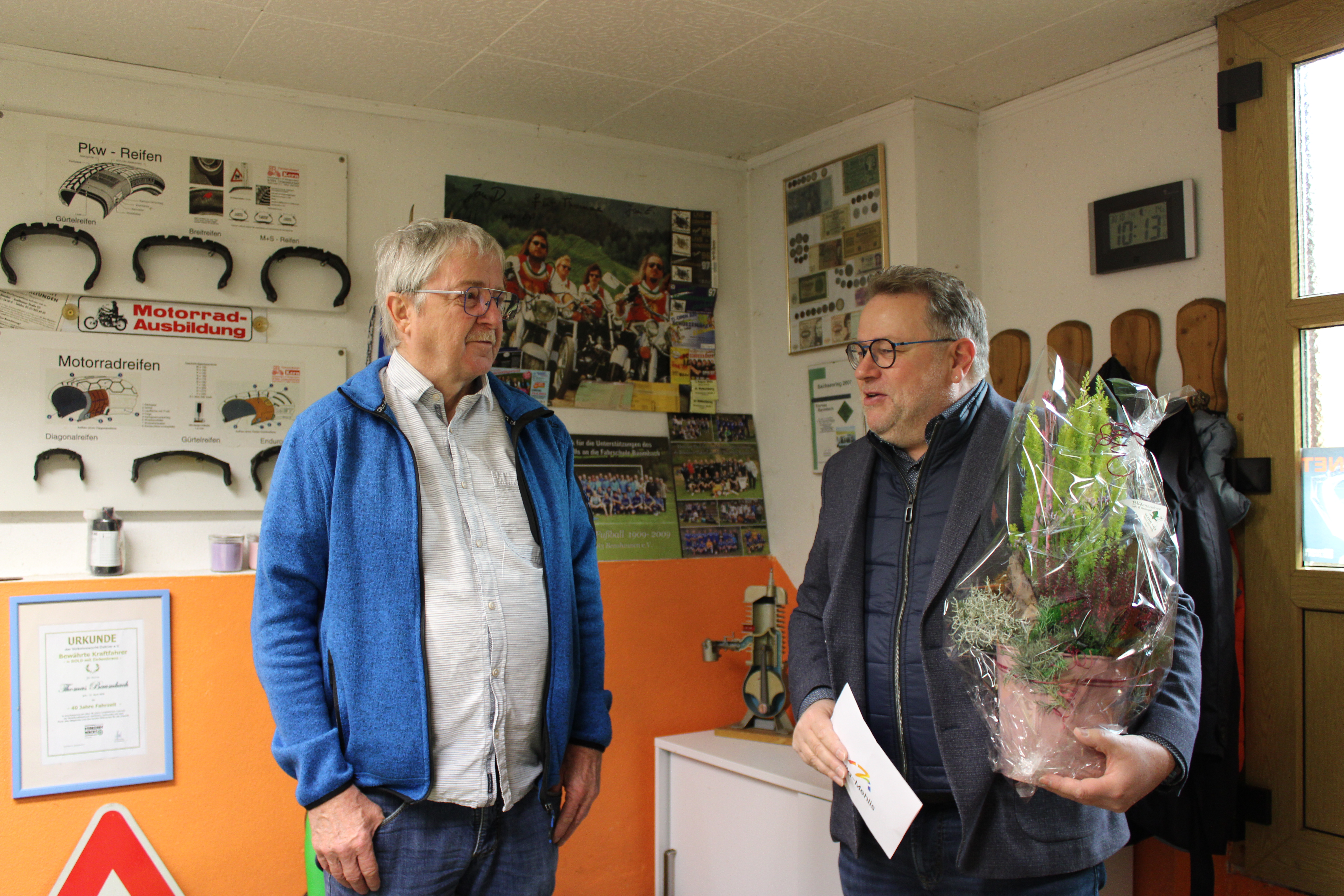 Thomas Baumbach hat sein Hobby zum Beruf gemacht. Schon immer habe er sich für Autos begeistert, sagt der Fahrlehrer auf die Frage, warum er sich für diesen Beruf entschieden habe. Dieser Tage begeht der Ebertshäuser das 35-jährige Bestehen seiner Fahrschule, die er am 1. Oktober 1990 gründete. Für Bürgermeister Torsten Widder war dieser Termin Anlass für einen Besuch. Er überbrachte Glückwünsche und betonte, dass der gute Ruf des Fahrlehrers für sich stehe. Torsten Widder wünschte weiterhin allzeit gute und vor allem unfallfreie Fahrt.