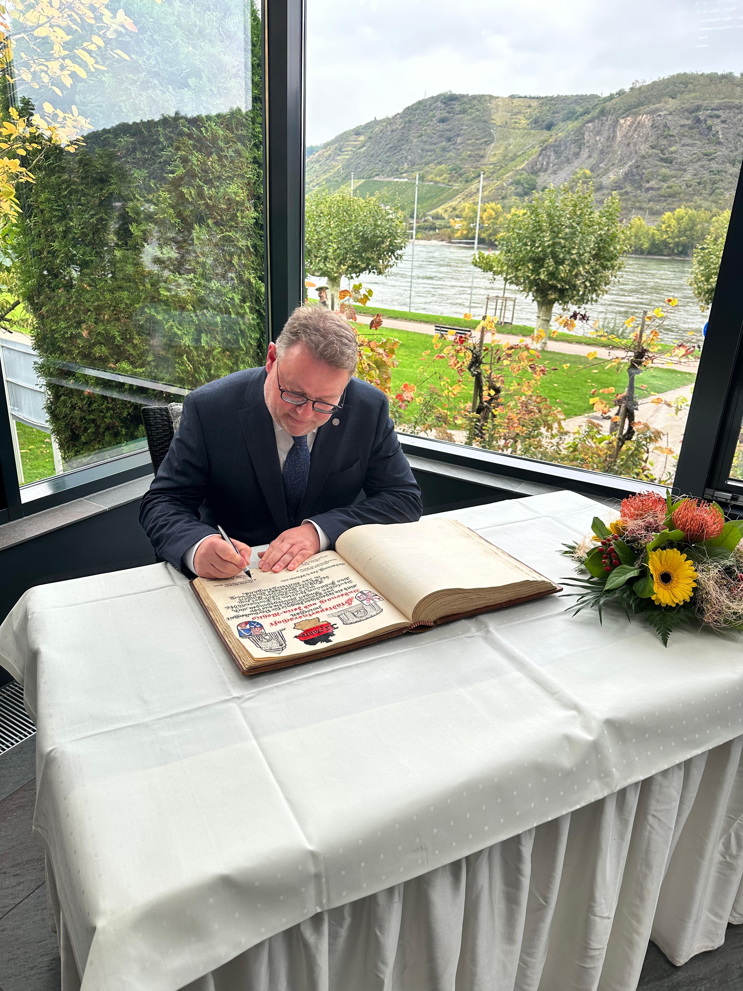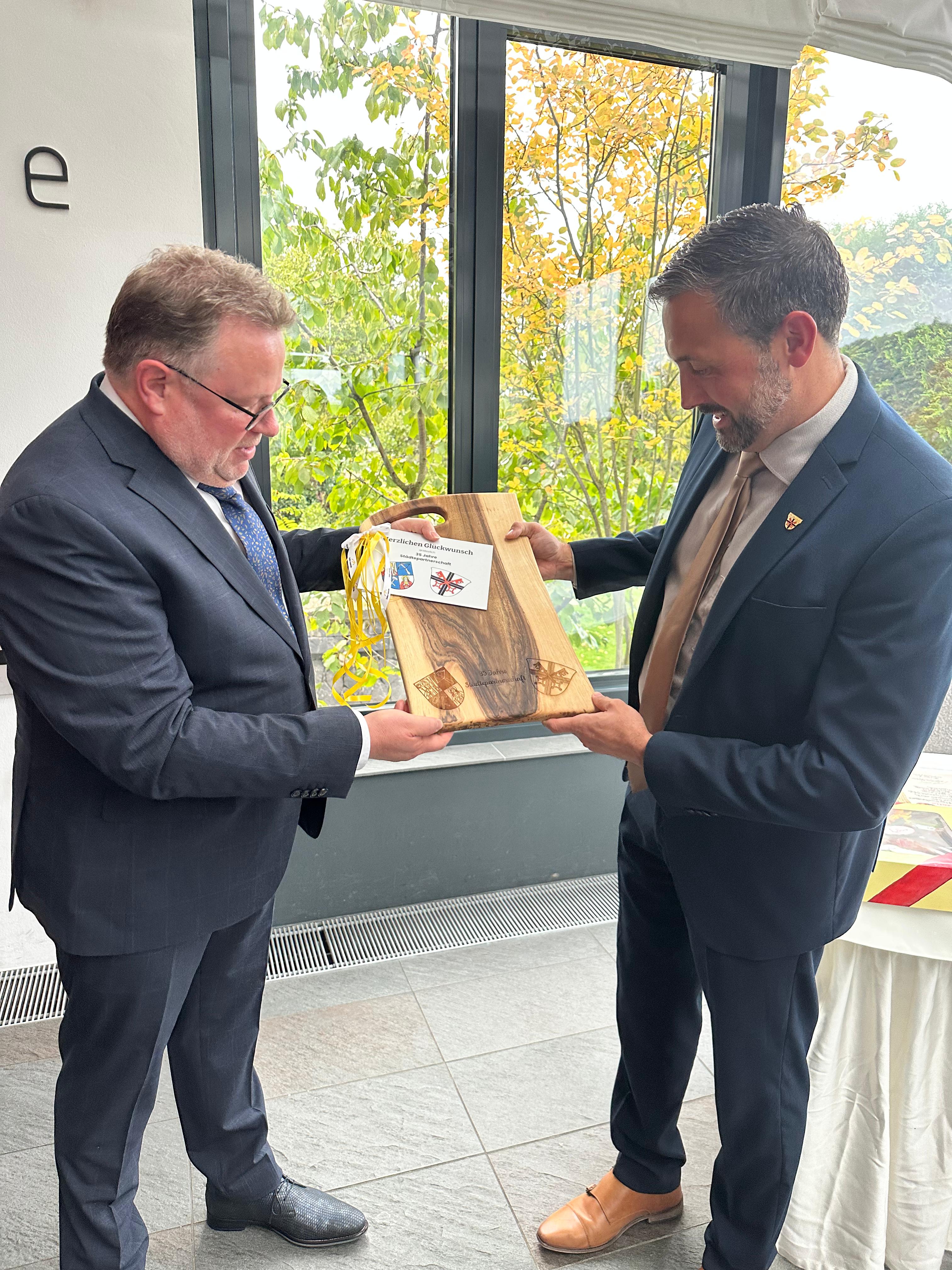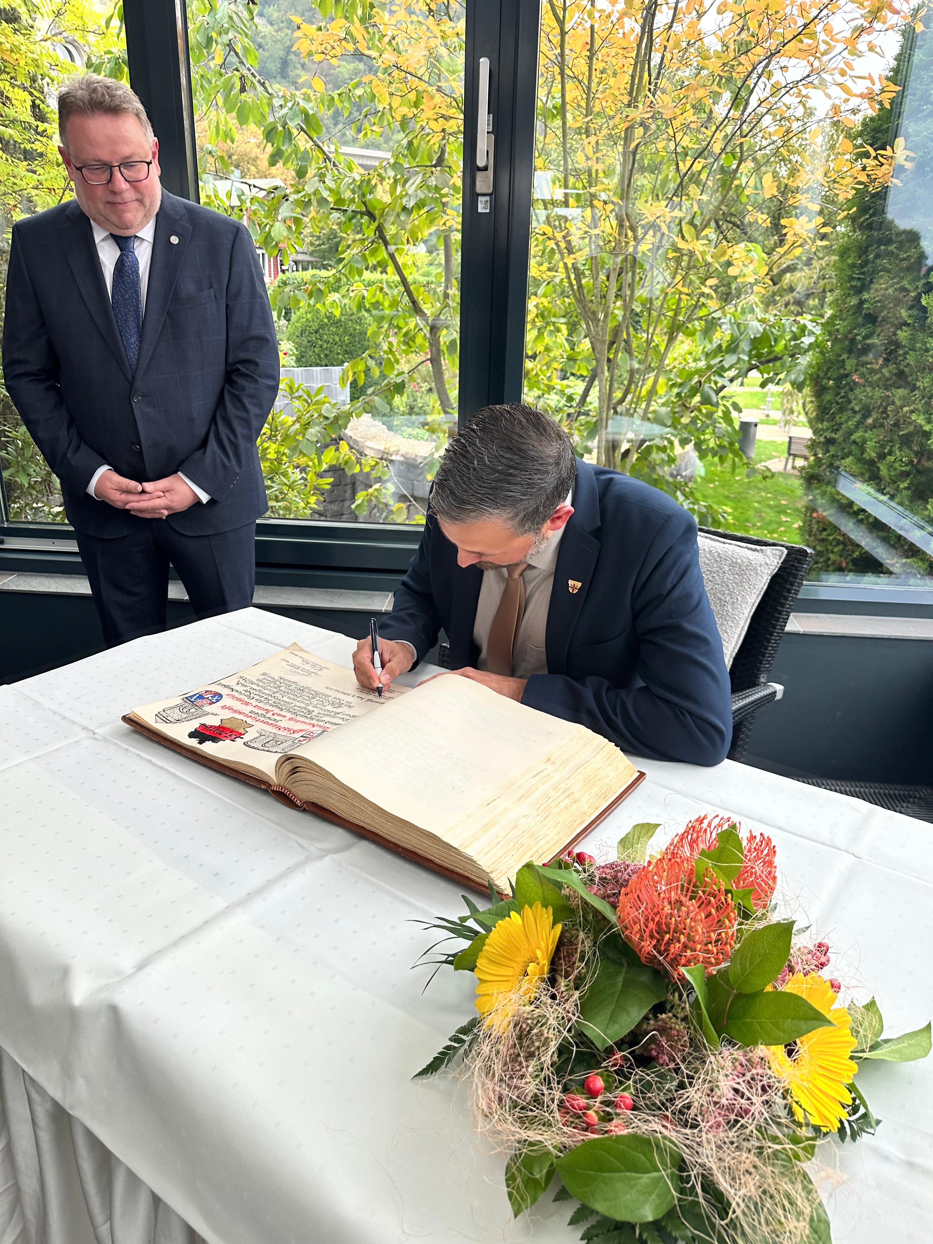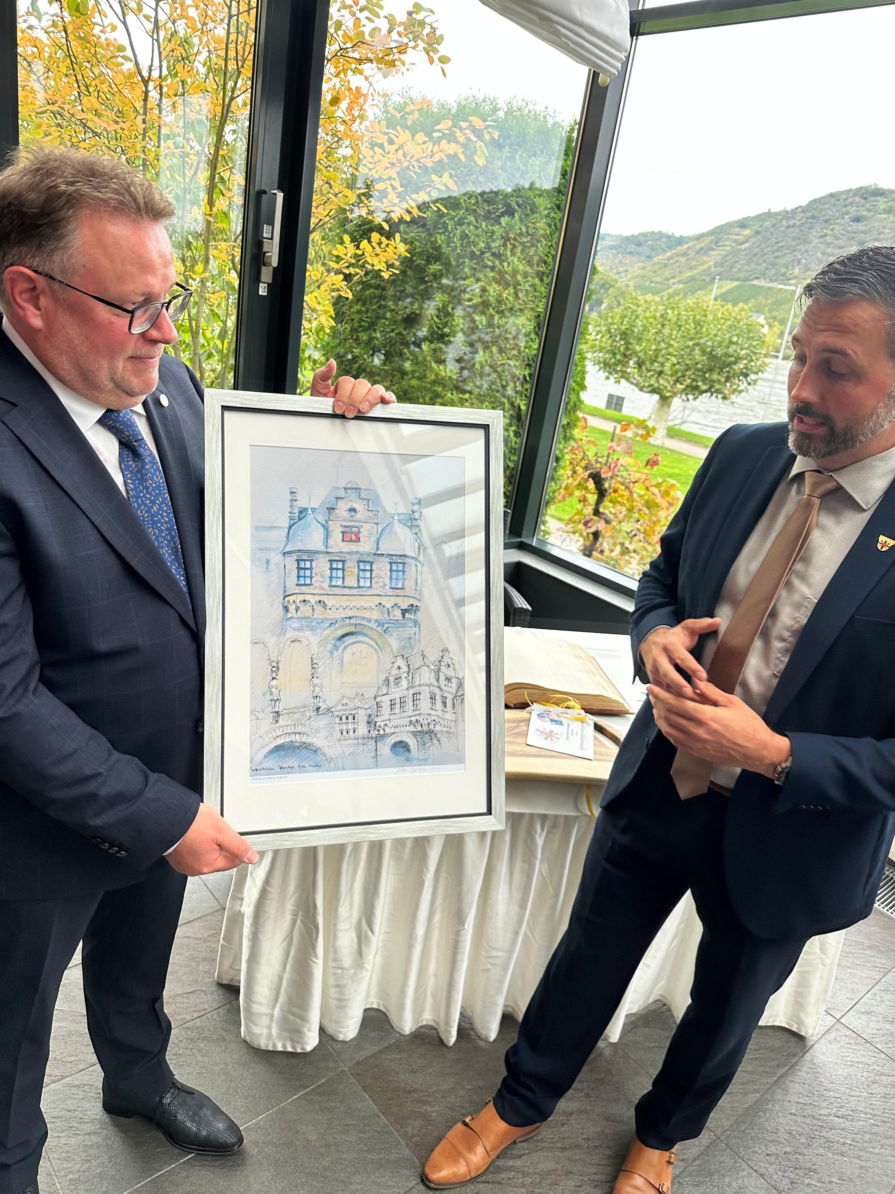 Am 3. Oktober fand im Parkhotel in Andernach ein Empfang des Oberbürgermeisters Christian Greiner mit rund 25 geladenen Gästen anlässlich des Jubiläums 35 Jahre Städtepartnerschaft statt. Bürgermeister Torsten Widder erinnerte zu dem Empfang an die Anfänge der Verbindung: „Es war ein Zeichen des Miteinanders, ein Signal der Freundschaft – und ein ganz praktisches Stück Wiedervereinigung. Während in Berlin noch über Verträge beraten wurde, lebten unsere beiden Städte bereits vor, was Einheit bedeutet: füreinander da zu sein, Brücken zu bauen, den Austausch zu pflegen“. Seither habe man Jubiläen gefeiert, gegenseitige Besuche organisiert und voneinander gelernt. „Ihre Stadt Andernach war und ist dabei ein wunderbarer Partner: reich an Geschichte, geprägt durch die Lage am Rhein, offen für neue Ideen“, sagte Torsten Widder.  Die Verbindung sei nicht nur Tradition, sondern lebendige Gegenwart. „Für uns als Städte bedeutet das: unsere Partnerschaft weiter lebendig zu halten, den Austausch weiterzuführen und wieder zu intensivieren, neue Generationen einzubeziehen. Gerade junge Menschen sollen erfahren, dass diese Verbindung mehr ist als eine Urkunde oder ein Eintrag ins Goldene Buch. Sie sollen sie erleben – in Begegnungen, in Projekten, in Freundschaften“, sagte Torsten Widder.