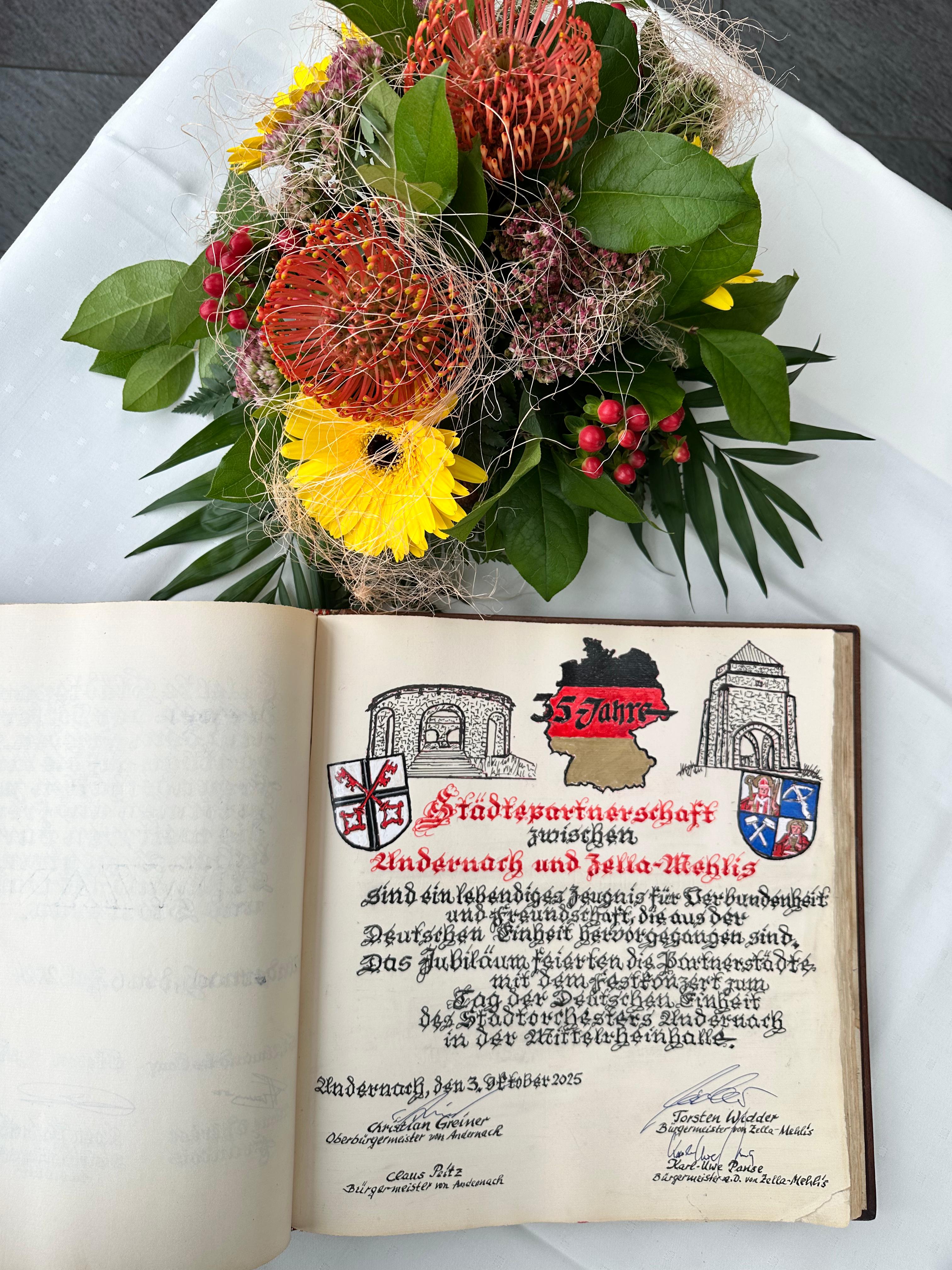 Ein ganz besonderes Jubiläum war der Grund für den jüngsten Besuch in der Zella-Mehliser Partnerstadt Andernach. Denn beide Städte können in diesem Jahr mit Stolz auf 35 Jahre Städtepartnerschaft zurückblicken. Zum Tag der Deutschen Einheit waren Bürgermeister Torsten Widder und Altbürgermeister Karl-Uwe Panse nach Andernach eingeladen, um sich dort in das Goldene Buch der Stadt einzutragen und das Festkonzert des Stadtorchesters zu besuchen, in dessen Rahmen Bürgermeister Torsten Widder die Festrede hielt.