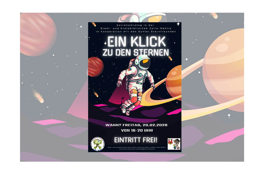 "Kommt mit auf eine Reise zu den Sternen", heißt es am kommenden Freitag, 20. Februar, in der Stadt- und Kreisbibliothek. Gemeinsam mit den Vereinsmitgliedern der Suhler Sternfreunde lädt das Team wieder alle Interessierten zum Astronomietag ein. Von 16 bis 20 Uhr dreht sich unter dem Thema "Ein Klick zu den Sternen" alles rund ums All.