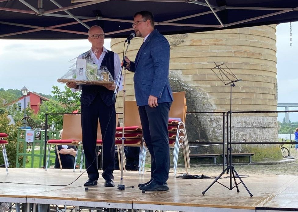 Das 44. Weinfest in Marktbreit am Main war Anlass für einen Besuch in der Partnerstadt. Der erste Beigeordnete Thomas Bischof vertrat zum Fest den Bürgermeister und überreichte an den Marktbreiter Bürgermeister Harald Kopp ein kleines Präsent aus Zella-Mehlis. „Wir freuen uns, dass wir seit der Eingemeindung von Benshausen die Partnerschaft mit Marktbreit fortführen und mit gegenseitigen Besuchen mit Leben erfüllen. Das Weinfest ist jedes Jahr ein schöner Anlass, um in dieser liebenswerten Stadt zu Gast zu sein“, sagte Thomas Bischof in seinen Grußworten zum Weinfest am Mainufer. Das nächste Wiedersehen wird es zum Stadtfest am 13. und 14. September dann in Zella-Mehlis geben.