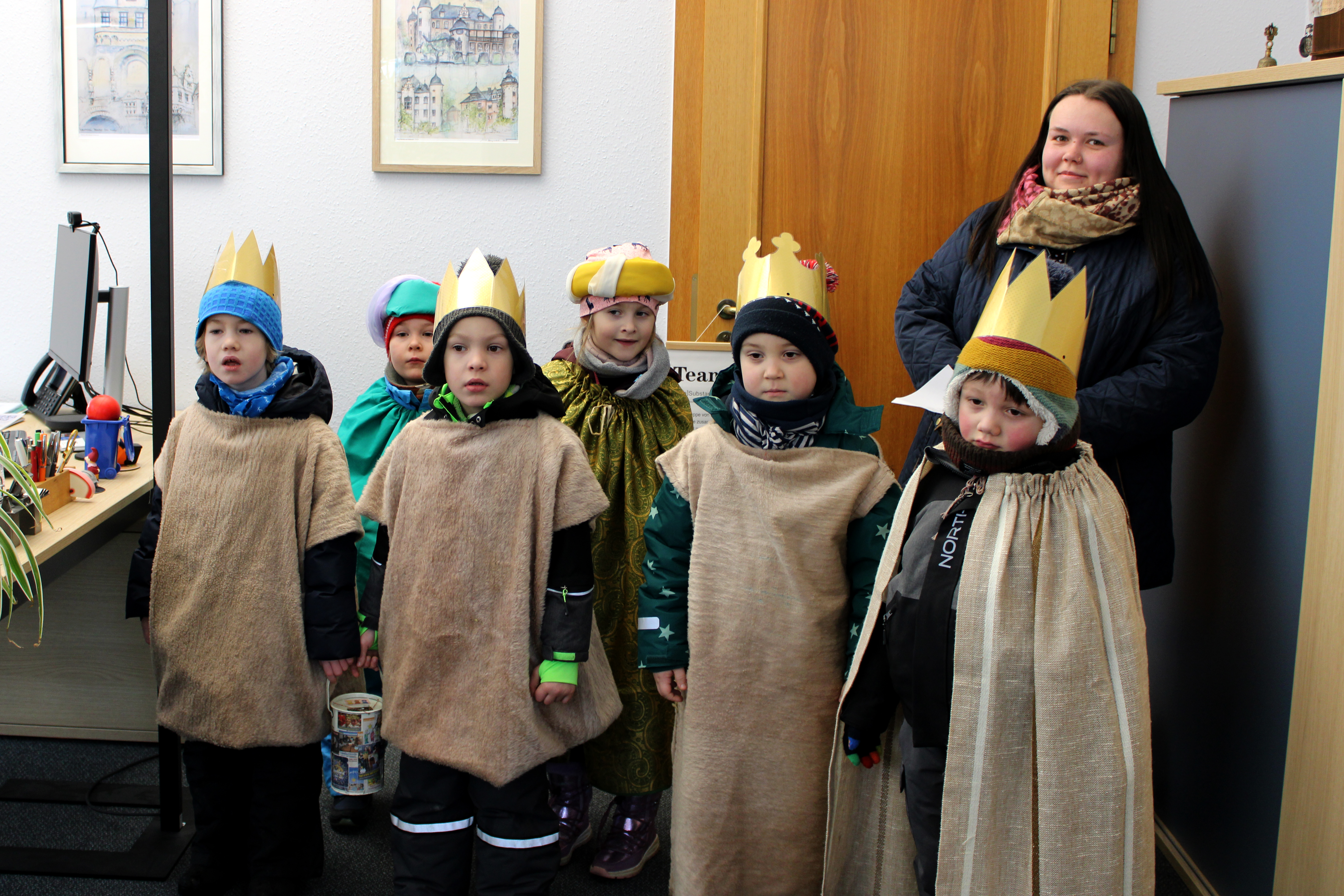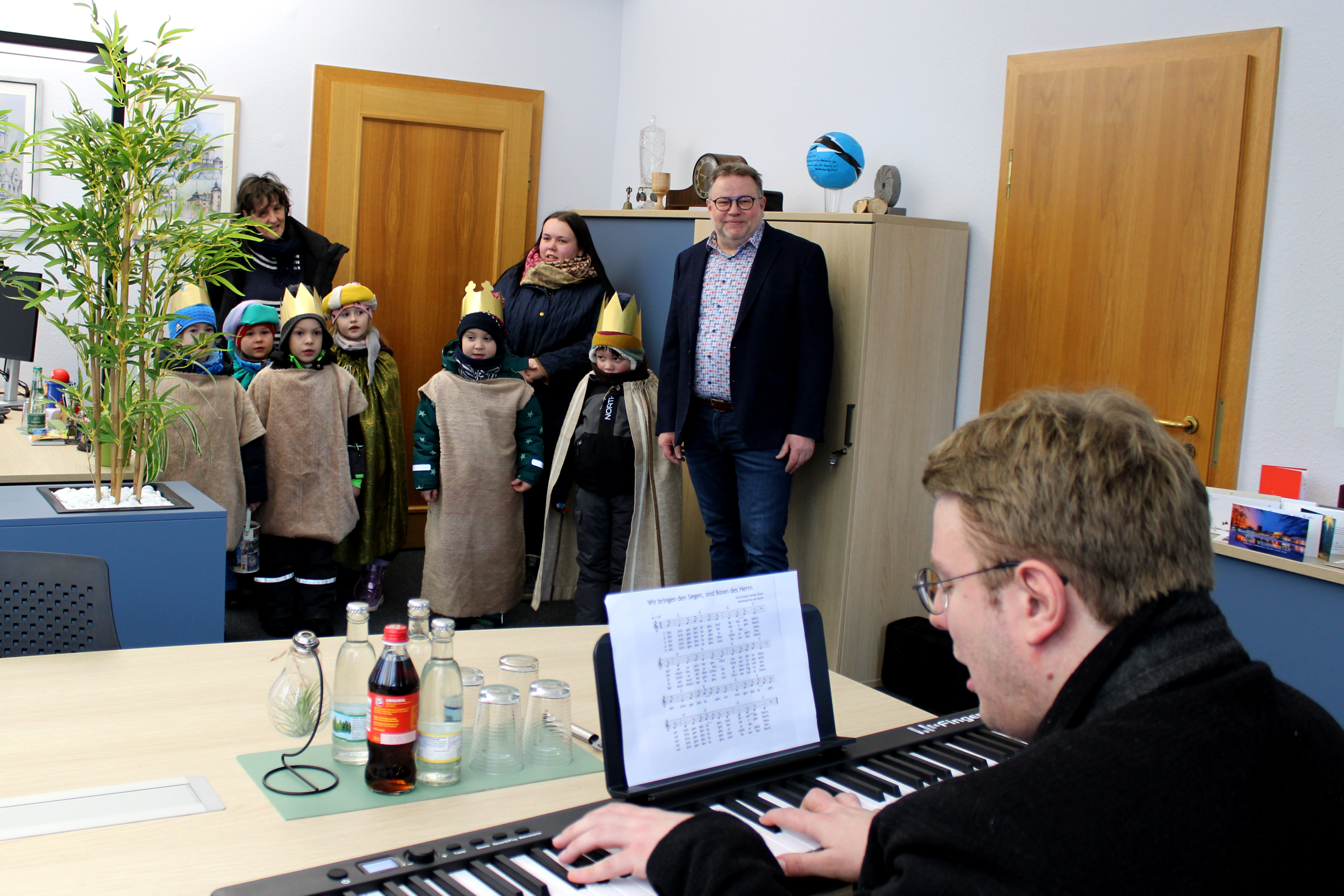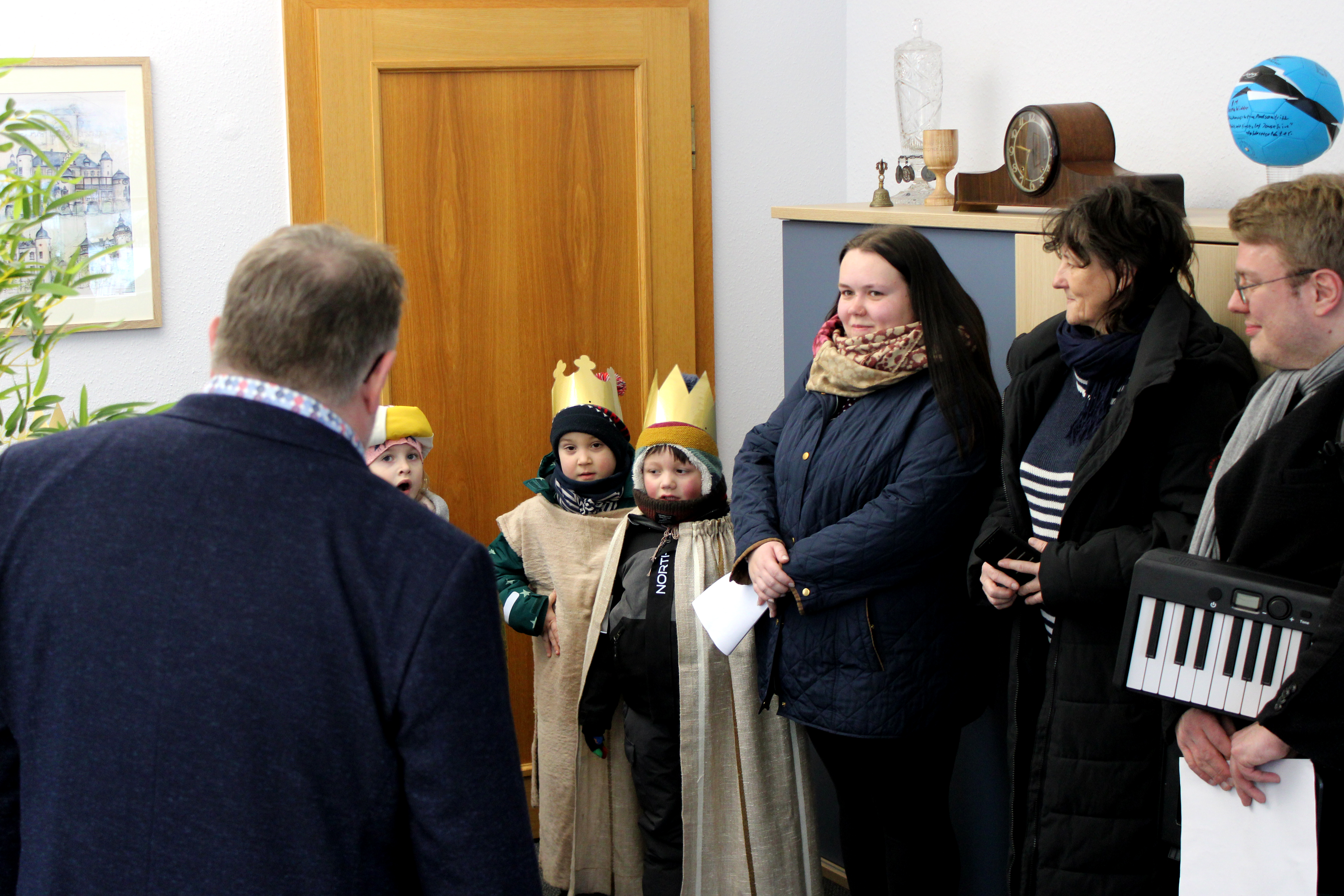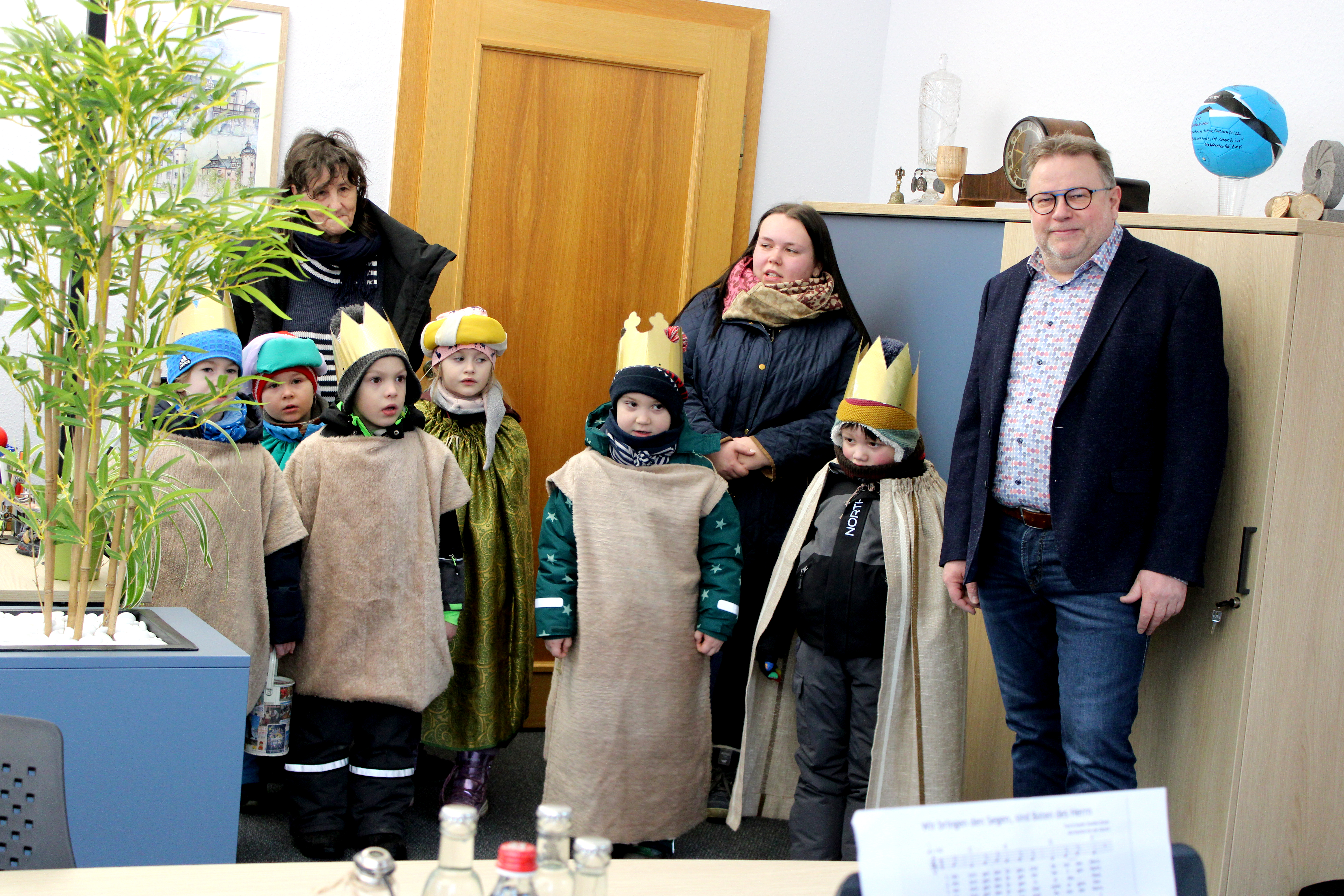 Die Sternsinger haben am 6. Januar traditionell den Segen ins Rathaus gebracht. Für Bürgermeister Torsten Widder ist der Besuch der Sternsinger ein wichtiger erster Termin im Jahr. Er begrüßte die Jungen und Mädchen des christlichen Kindergartens "Sonnenschein" und wünschte ihnen ein glückliches neues Jahr. Gemeinsam mit ihren Erzieherinnen Andrea Ansorg und Johanna Hemken sowie Kantor Lukas Klöppel waren die sechs Kinder der Vorschulgruppe zu Gast im Büro Bürgermeister und Fachbereichen der Stadtverwaltung und überbrachten den Segen.