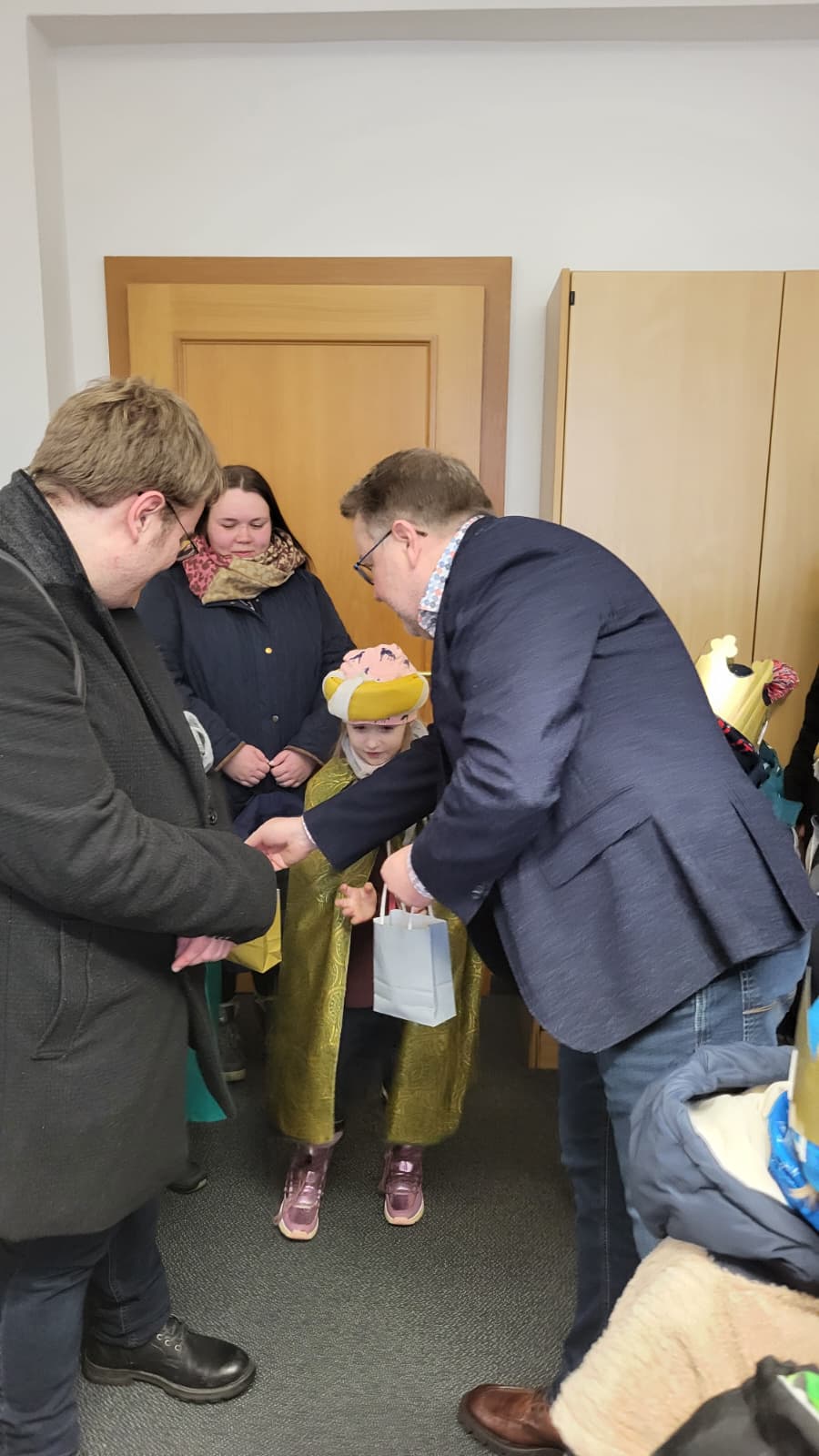 Die Sternsinger trugen ihre Kostüme, die an die Heiligen Drei Könige erinnern und hatten verschiedene Lieder vorbereitet. Sie haben unter anderem "Wir bringen den Segen, sind Boten des Herrn" gesungen, das Kantor Lukas Klöppel am Keyboard begleitete. Als Dankeschön erhielten die Jungen und Mädchen Äpfel und kleine Süßigkeiten.