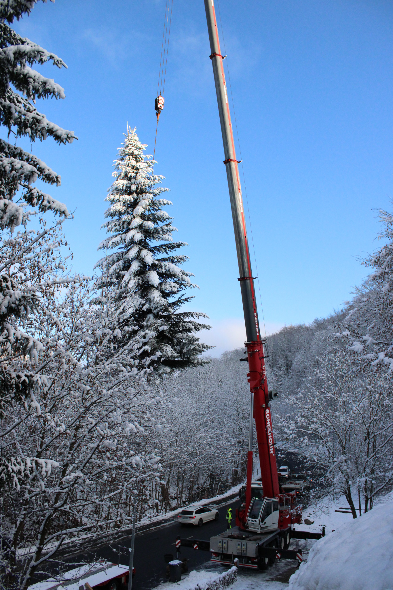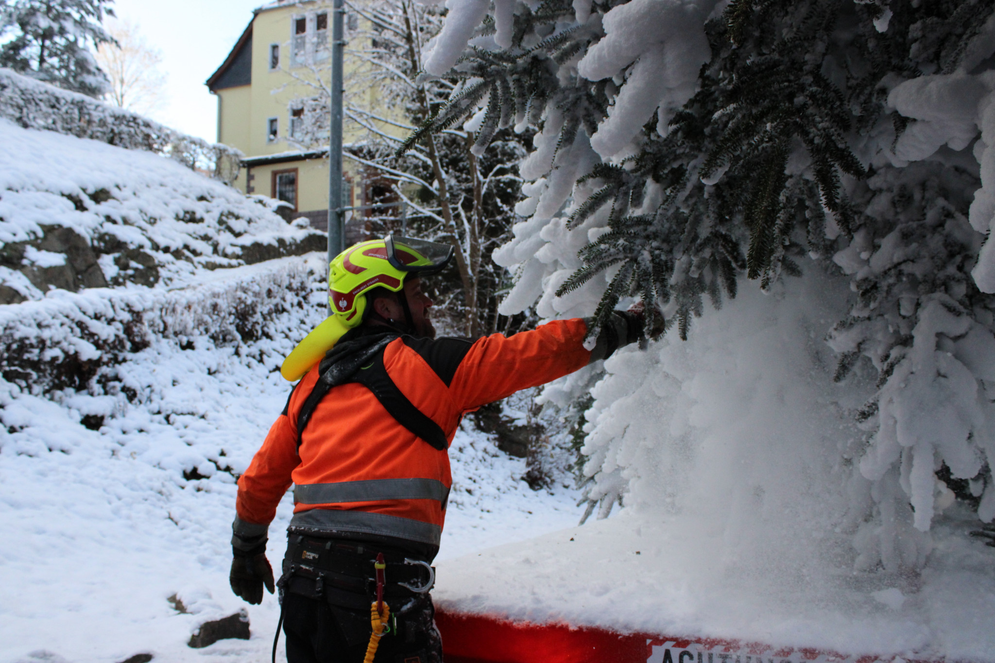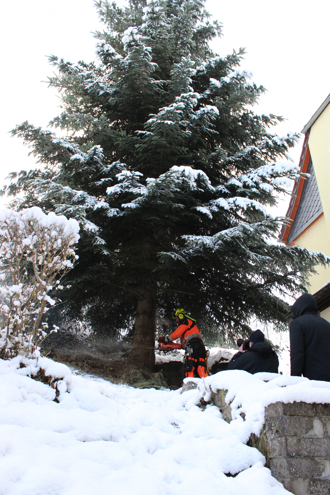 Die Herausforderungen beim Fällen am Freitagmorgen waren nicht nur die Minusgrade, sondern auch die Hanglage. Mit insgesamt 20 Tonnen schweren Gewichten wurde der Kran zusätzlich beschwert, um den Baum sicher verladen zu können. Gekonnt machten sich die Mitarbeiter des Stadtservices wie in jedem Jahr daran, den Baum zunächst zu sichern und anschließend zu schneiden. Einmal dass alle Vorbereitungen getroffen waren, verlief das eigentliche Fällen ganz schnell und die Nordmanntonne baumelte am Kran. "Ein richtiges Prachtexemplar", waren sich alle Beteiligten einig.