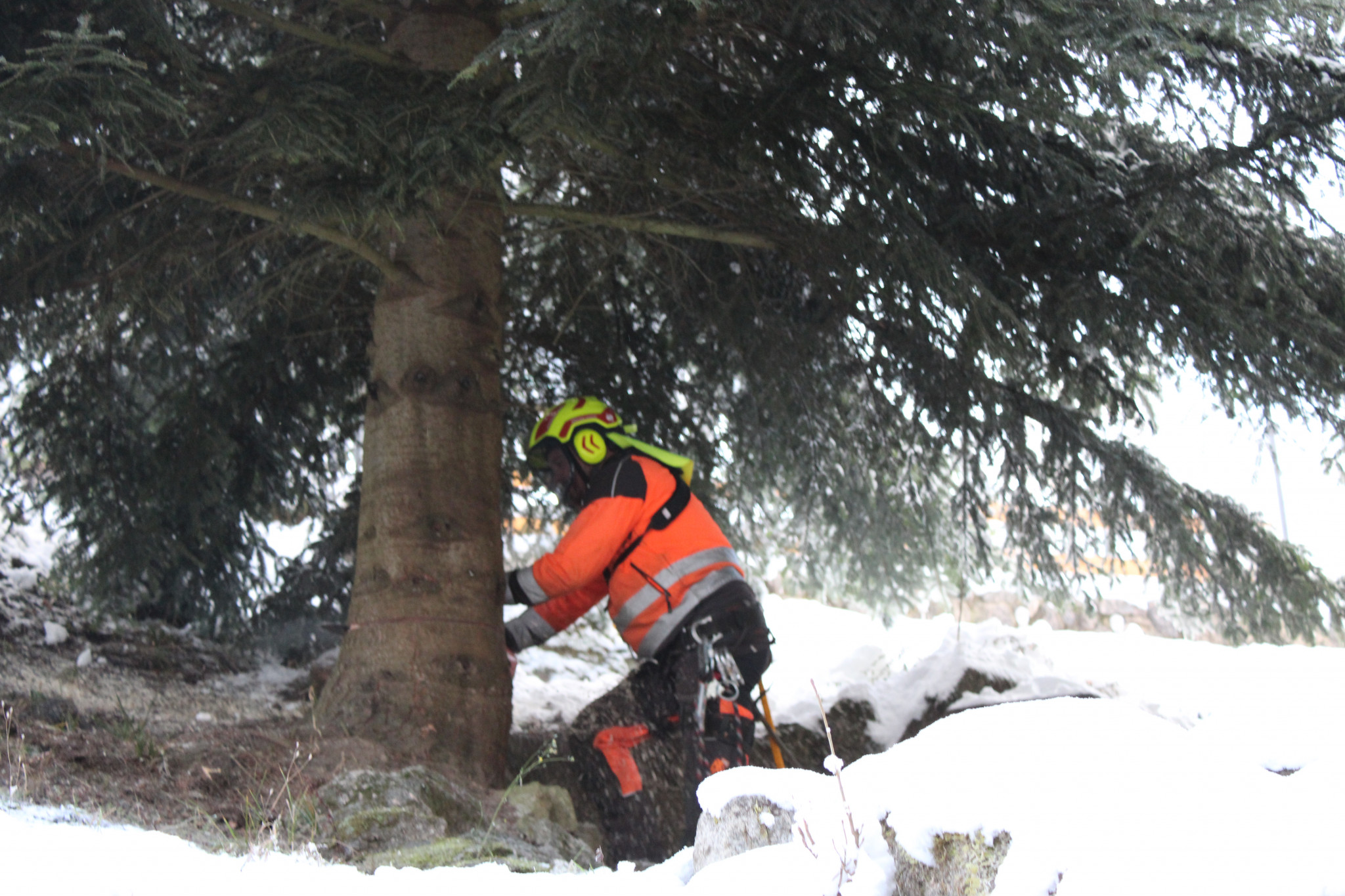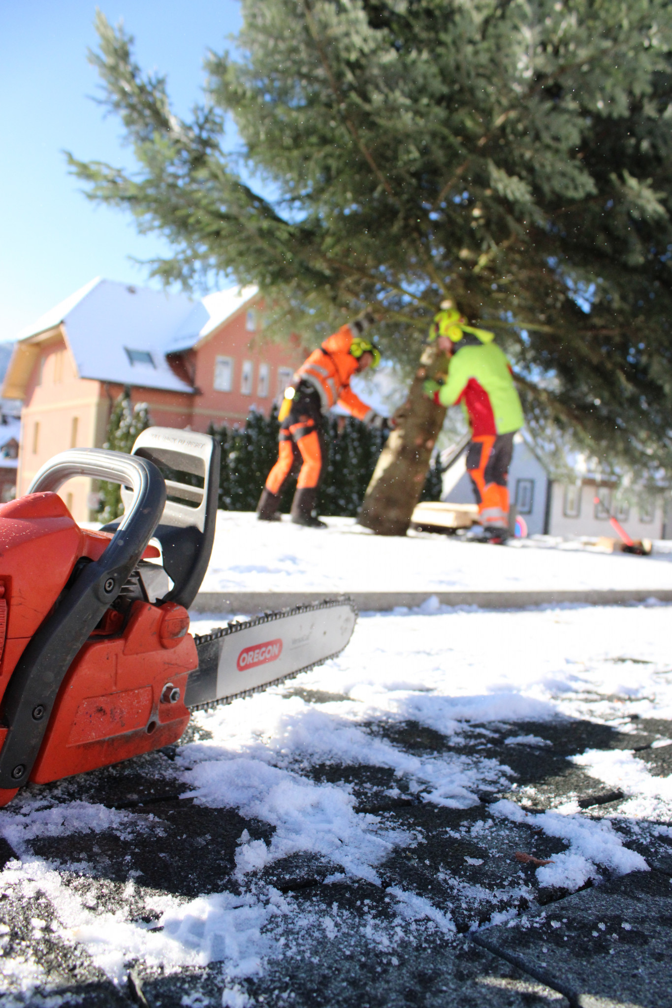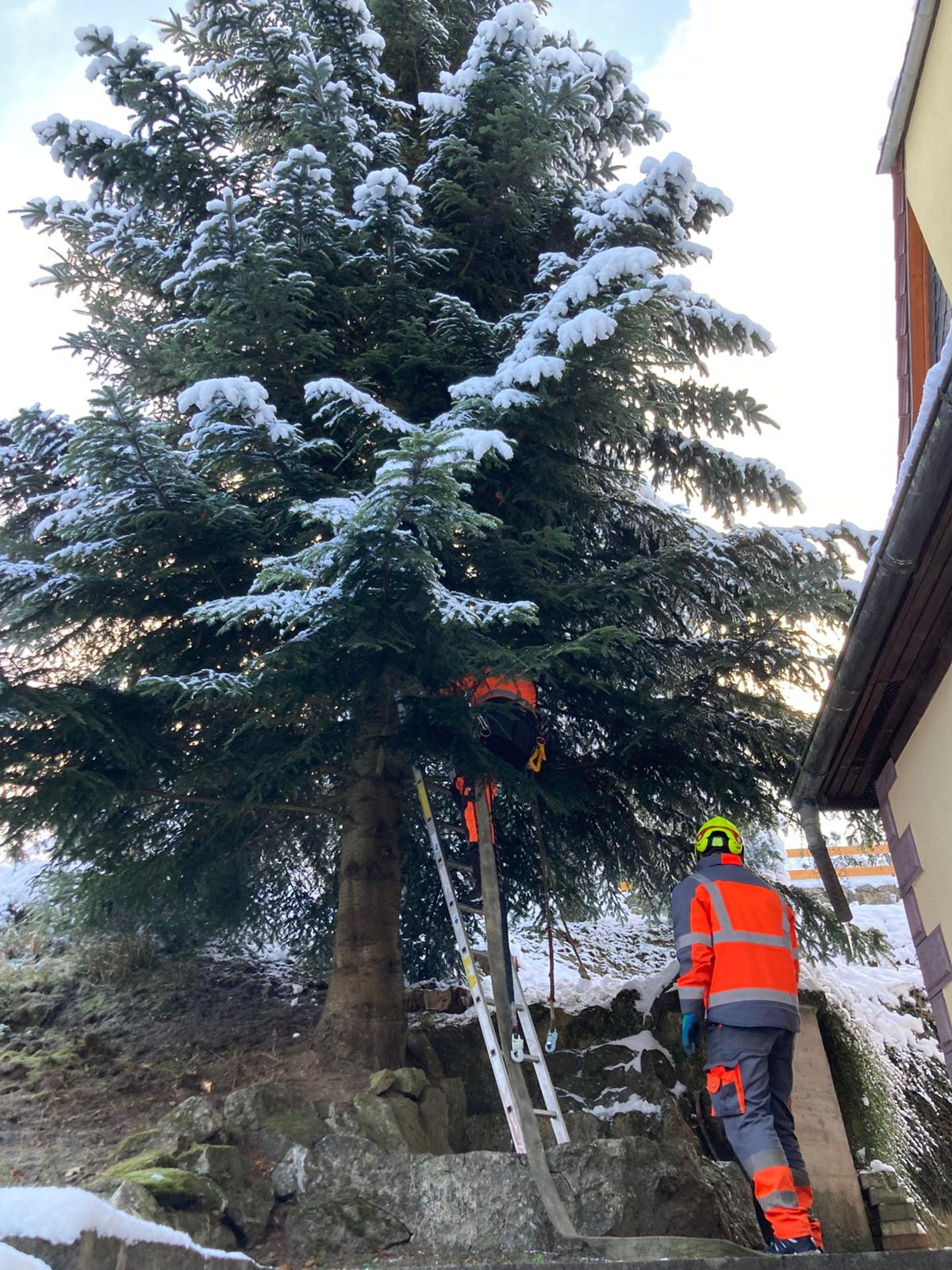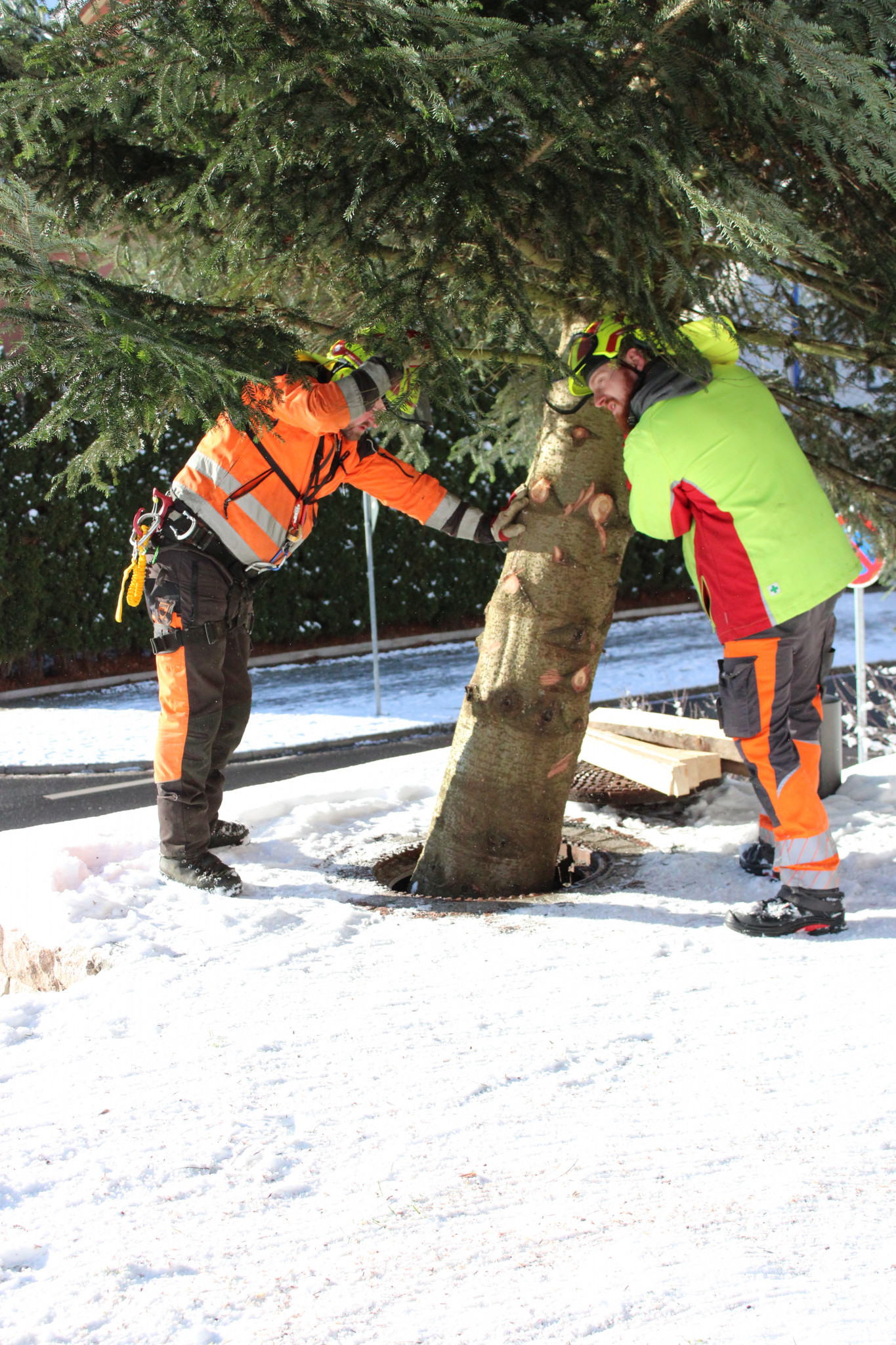 Die Herausforderungen beim Fällen am Freitagmorgen waren nicht nur die Minusgrade, sondern auch die Hanglage. Mit insgesamt 20 Tonnen schweren Gewichten wurde der Kran zusätzlich beschwert, um den Baum sicher verladen zu können. Gekonnt machten sich die Mitarbeiter des Stadtservices wie in jedem Jahr daran, den Baum zunächst zu sichern und anschließend zu schneiden. Einmal dass alle Vorbereitungen getroffen waren, verlief das eigentliche Fällen ganz schnell und die Nordmanntonne baumelte am Kran. "Ein richtiges Prachtexemplar", waren sich alle Beteiligten einig.