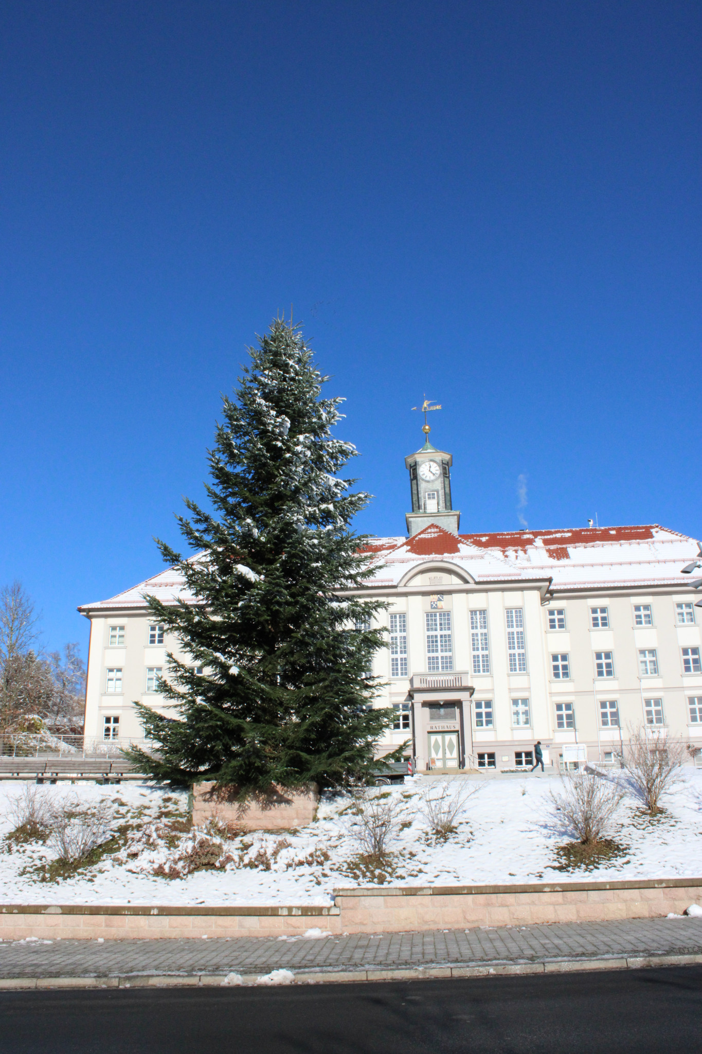 Eine 14 Meter hohe Nordmanntanne steht in diesem Jahr als Weihnachtsbaum vor dem Rathaus. Am Freitagvormittag haben ihn die Mitarbeiter des Fachdienstes Stadtservice gemeinsam mit der Firma Schelhorn in der Heinrich-Ehrhardt-Straße gefällt, transportiert und auf dem Platz vorm Rathaus aufgestellt. In der kommenden Woche wird der Baum geschmückt.