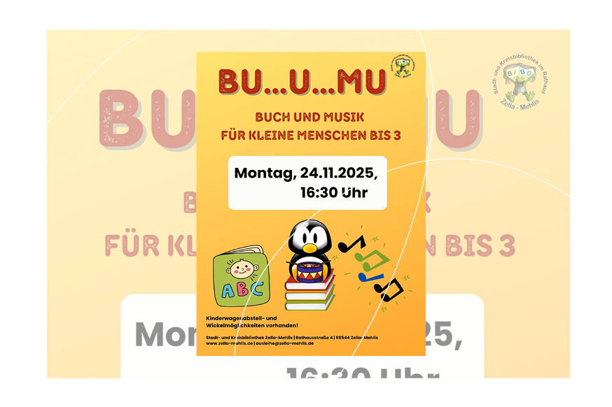 Am Montag, 24. November, um 16.30 Uhr lädt die Stadt- und Kreisbibliothek wieder zur monatlichen Veranstaltung „Bu…u…Mu: buch und Musik für kleine Menschen bis 3“ ein. Die kleinsten Zella-Mehliser können zusammen mit Eltern und Großeltern die verschiedensten Pappbücher entdecken und bei Fingerspielen ihre Koordination verbessern.