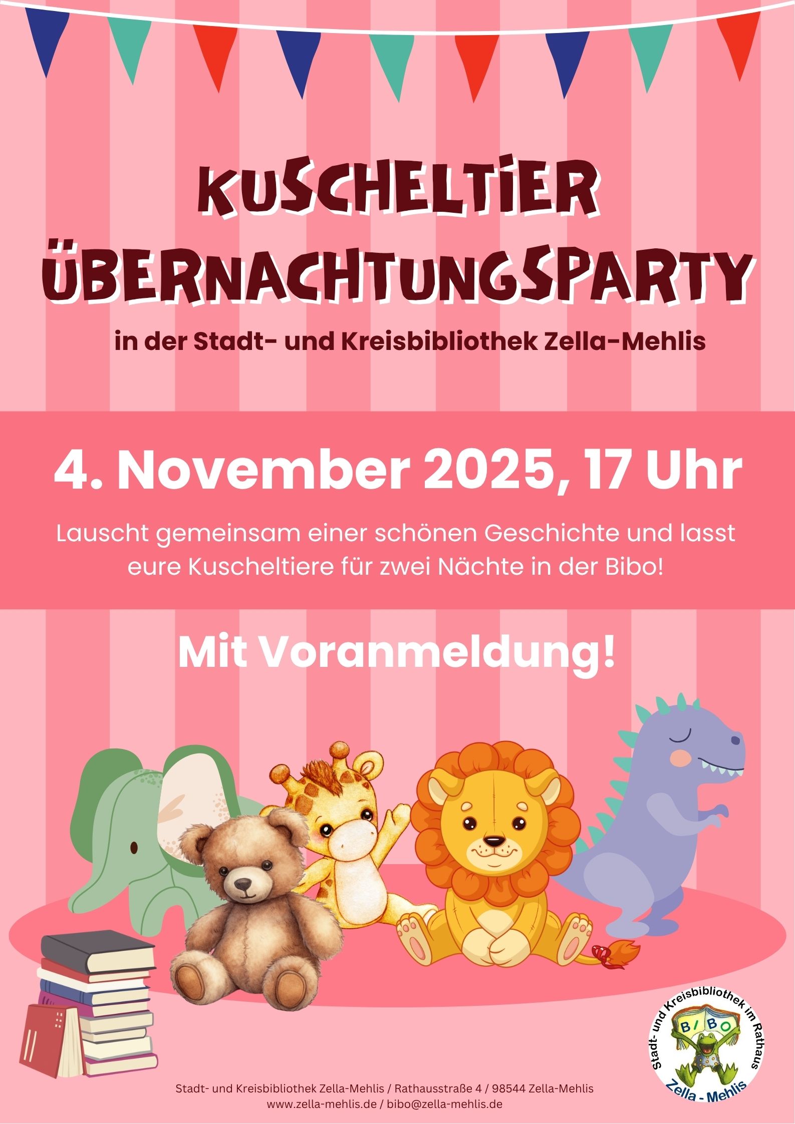 Zu einer ganz besonderen Übernachtungsparty lädt das Team des Stadt- und Kreisbibliothek im November ein. Denn jeder wollte schon einmal wissen: Was passiert eigentlich, wenn die Bibliothek geschlossen ist und es dunkel wird? "Eure Kuscheltiere finden es für euch heraus. Bringt euer Kuscheltier am 4. November zu uns in die Bibliothek, erlebt gemeinsam um 17 Uhr eine spannende Vorlesestunde und verabschiedet euch dann von euren Lieblingen. Am 6. November dürft ihr sie wieder abholen“, lädt das Team um Leiterin Daniela Bickel ein, bei der Kuscheltierübernachtungsparty mitzumachen.