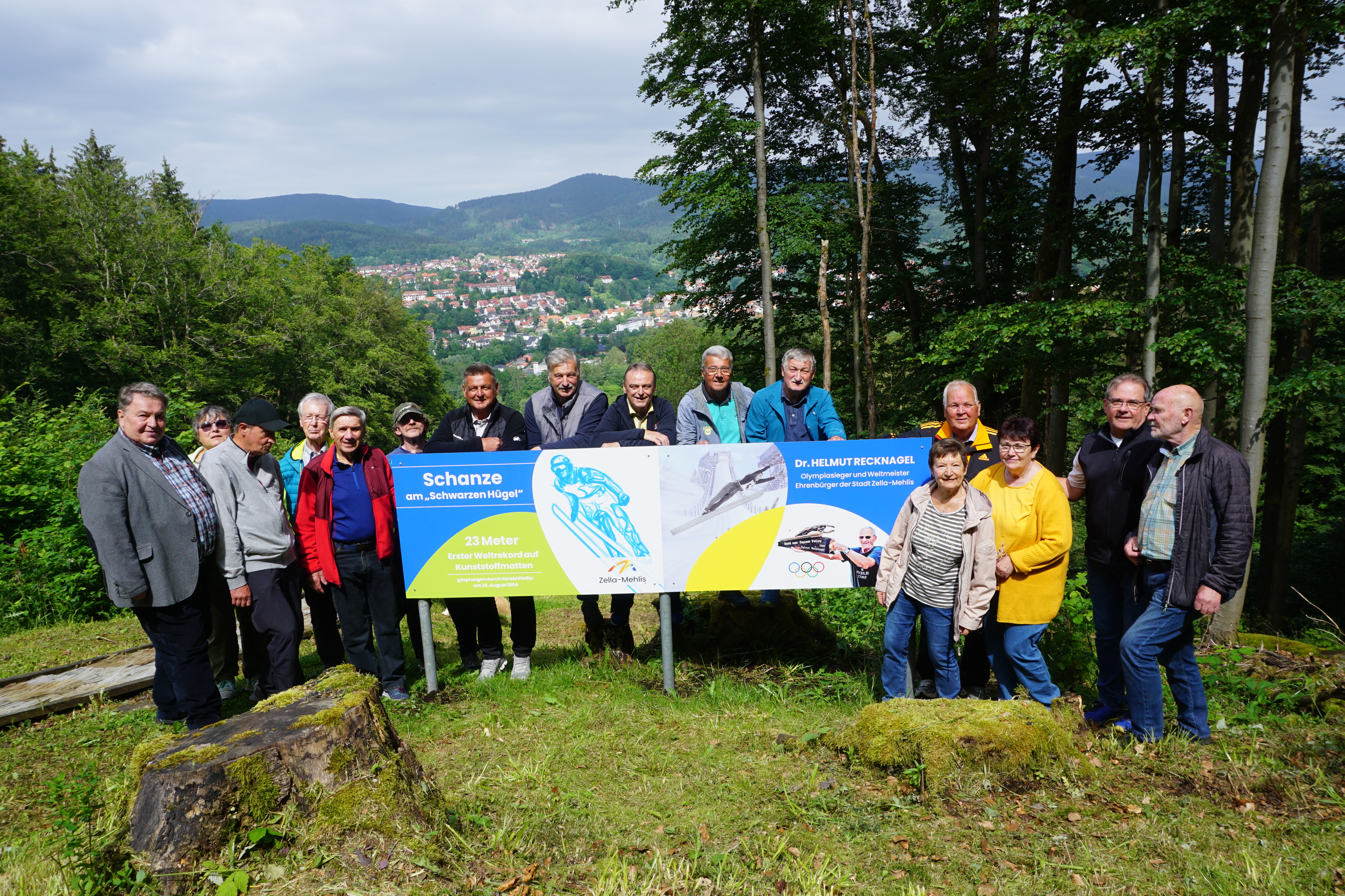 Auf Initiative des Skispringer-Stammtischs ist jetzt eine große Erinnerungstafel an Helmut Recknagel und an die Erfindung der Skisprungmatten enthüllt worden. Sie steht am Regenberg, am Schwarzen Hügel, wo Helmut Recknagel gemeinsam mit anderen Skispringern aus der Region beim ersten Testlauf für die Skisprungmatten dabei war. Der Zella-Mehliser Hans Renner, Trainer der DDR-Nationalmannschaft im Skisprung, hatte sie erfunden und hier erprobt.