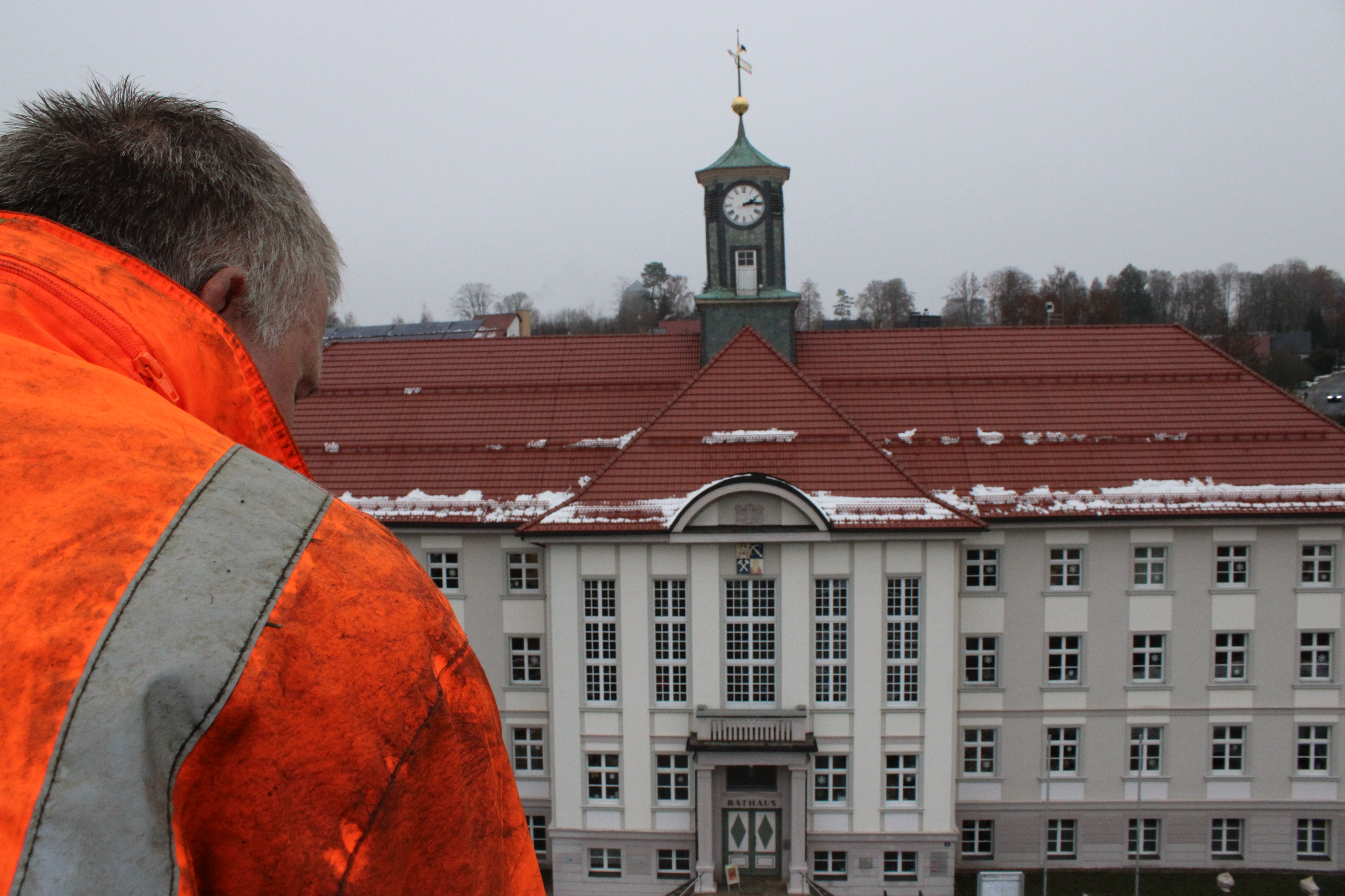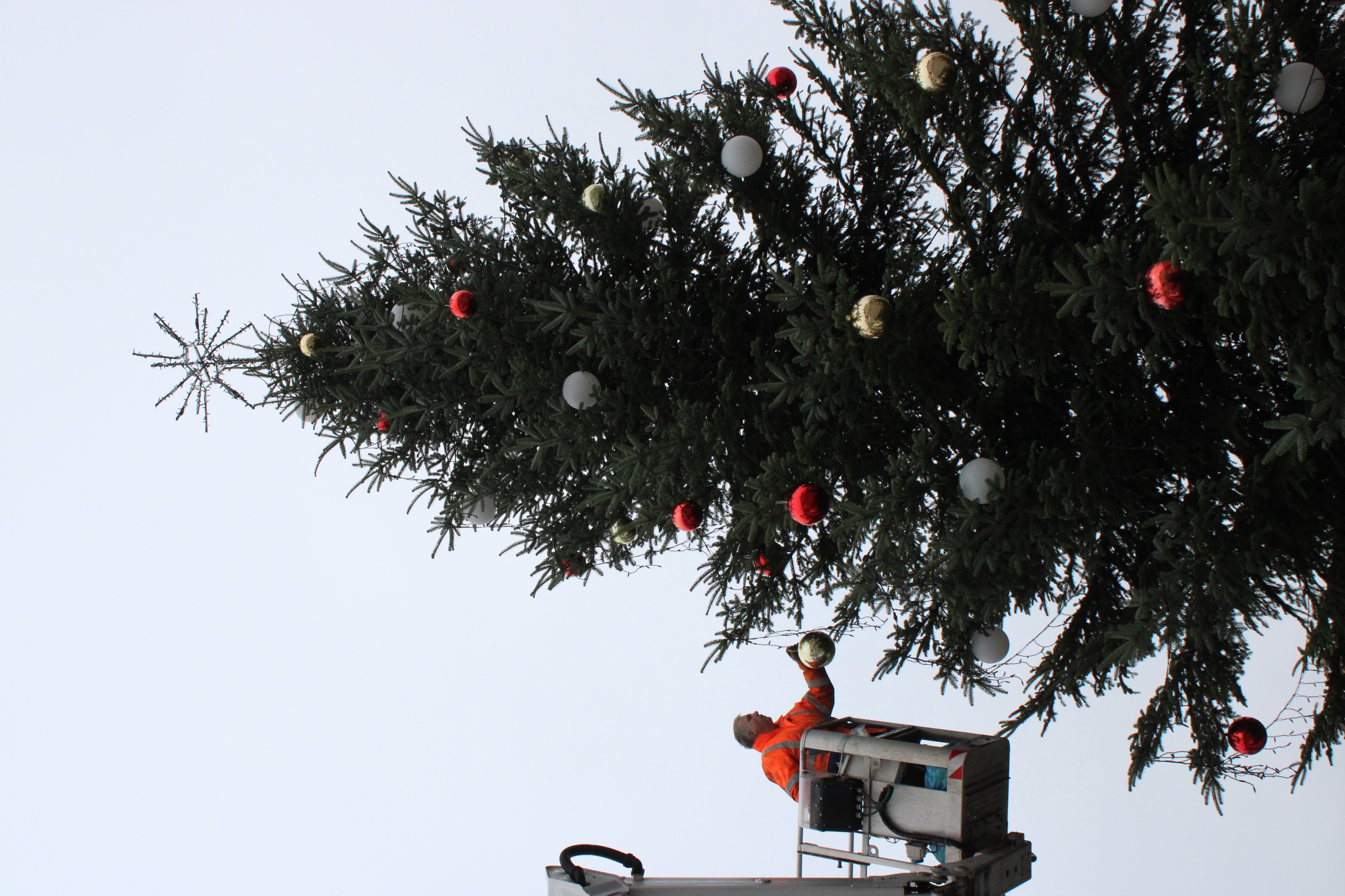 Am Dienstag, 25. November, haben die Mitarbeiter des Fachdienstes Stadtservice und Mitarbeiter der Firma Elektro Wolf den Weihnachtsbaum vor dem Rathaus geschmückt. In Kleinarbeit wurden die Kabel und Schnüre gezogen, um die Deko anzubringen: Einen Stern an der Spitze, eine Lichterkette und zusätzlich 70 Weihnachtskugeln. Beim Schmücken wurde auf traditionelle rote und goldene Kugeln sowie rotleuchtende Weihnachtskugeln zurückgegriffen.