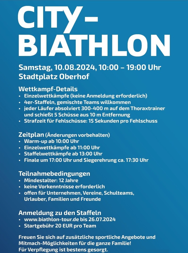 „Wir freuen uns auf den kommenden Samstag und darauf, zahlreiche Gäste und Teilnehmer bei unserem Citybiathlon begrüßen zu dürfen“, so André Knapp abschließend.
