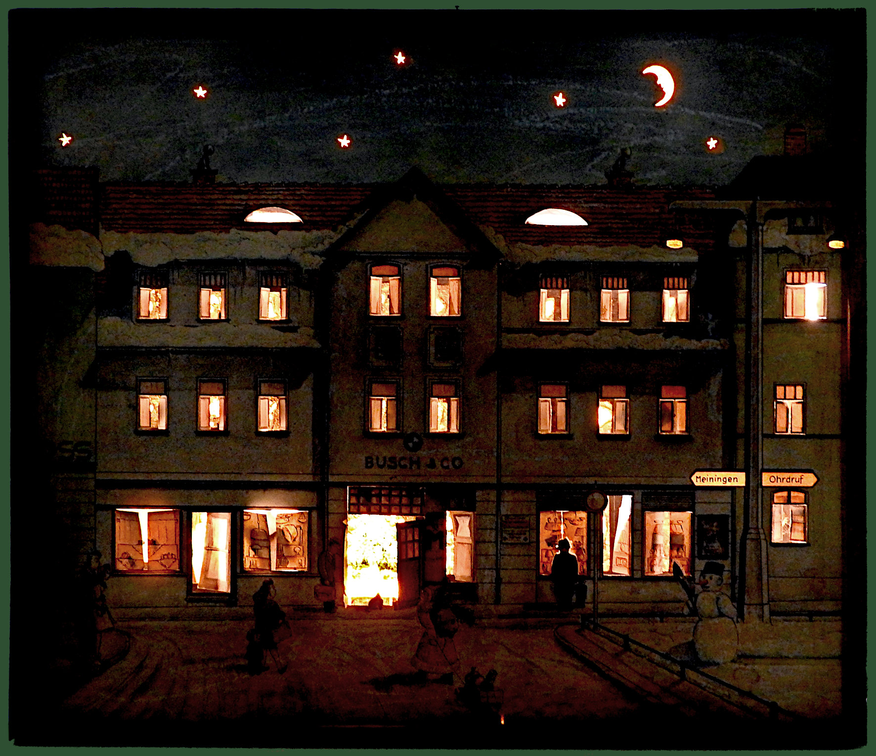 Markt 5. Seine Fenster, Türen und Schaufenster können geöffnet werden. Dahinter finden sich gemalte, zumeist weihnachtliche Motive. Der Nikolaus erscheint hinter dem Fenster rechts oben, mittig in der Toreinfahrt sieht man nach Türöffnung den geschmückten Weihnachtsbaum. Eine Besonderheit machte ihn für die Kinder wohl noch wundervoller: die Türchen, Mond, Sterne und Straßenlampen sind von hinten mit sechs Glühlämpchen zu beleuchten gewesen. Auf den 29 „Türchen“ finden sich keine Zahlen. Wahrscheinlich waren die unteren jeweils als drei Konvolute zu öffnen.