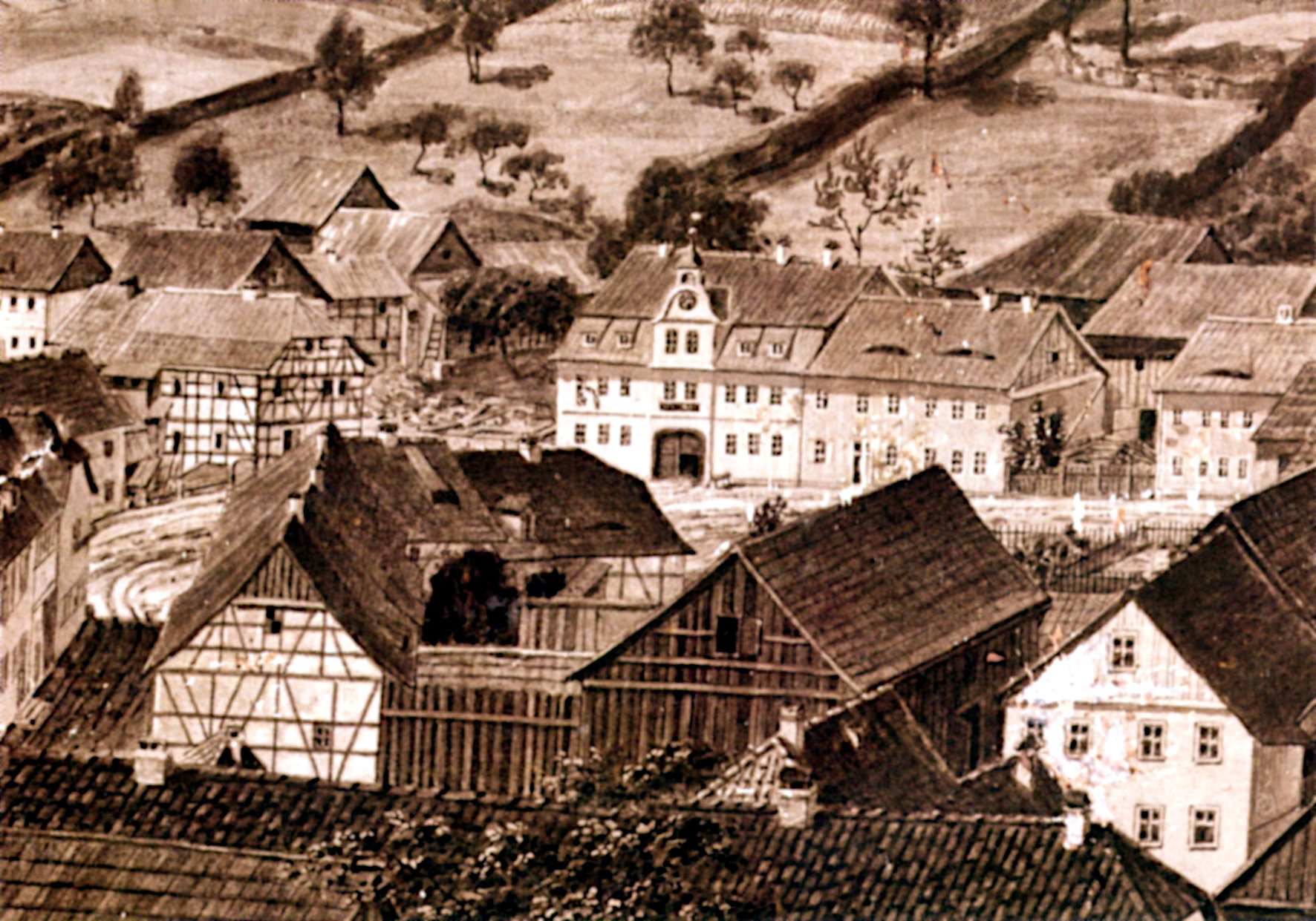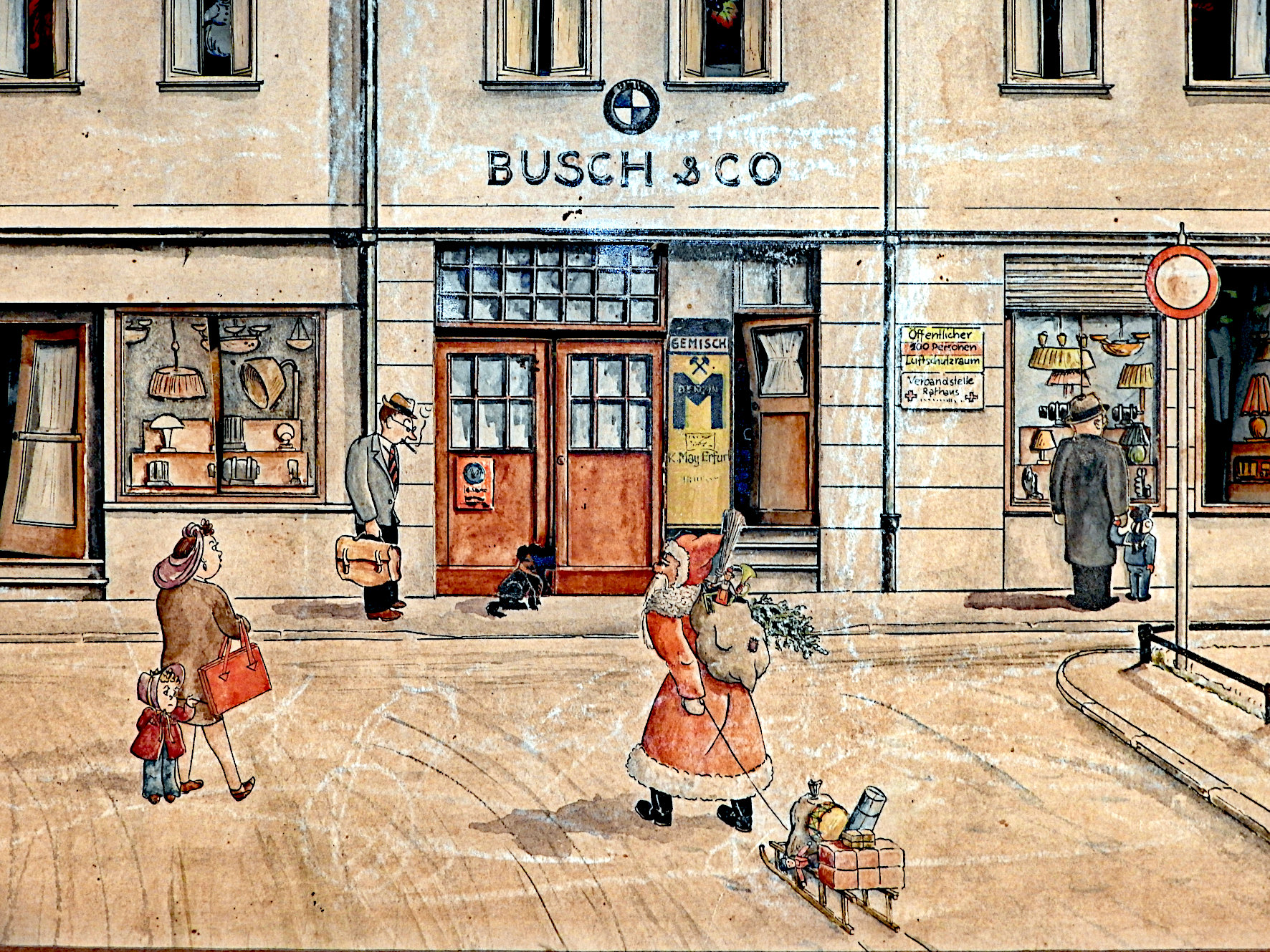 Beim Adventskalender entführt den Betrachter schon der erste Anschein in die 1940er Jahre. Die dargestellten Personen sind zeittypisch gekleidet, nicht das Christkind, sondern der Weihnachtsmann bringt die Geschenke mit dem Schlitten. Stutzig macht die Beschriftung neben dem Hauseingang: „Öffentlicher 200 Personen Luftschutzraum“ und „Verbandstelle Rathaus“ heißt es da. Wir befinden uns eindeutig in Kriegszeiten, in denen der ehemalige Bierkeller des Gasthauses als Luftschutzraum diente. Zeitlich noch genauer lässt sich der Fertigungszeitpunkt des Kalenders durch verschiedene Anhaltspunkte auf der Rückseite und Angaben der Familie Diem eingrenzen. Gestaltet hat ihn Karl Kreß, der 1937/38 mit seiner Frau aus Nürnberg nach Zella-Mehlis kam, um in den Walther-Werken zu arbeiten. In seiner Freizeit betätigte er sich als Maler und Grafiker und hatte laut Aussage der Familie auch Verbindung zur Dachauer Malerschule. In seiner Familie gilt er noch heute als sehr kinderlieb. 1939, mit der Geburt der ersten Tochter Ingeborg, spätere Diem, zog die Familie in das