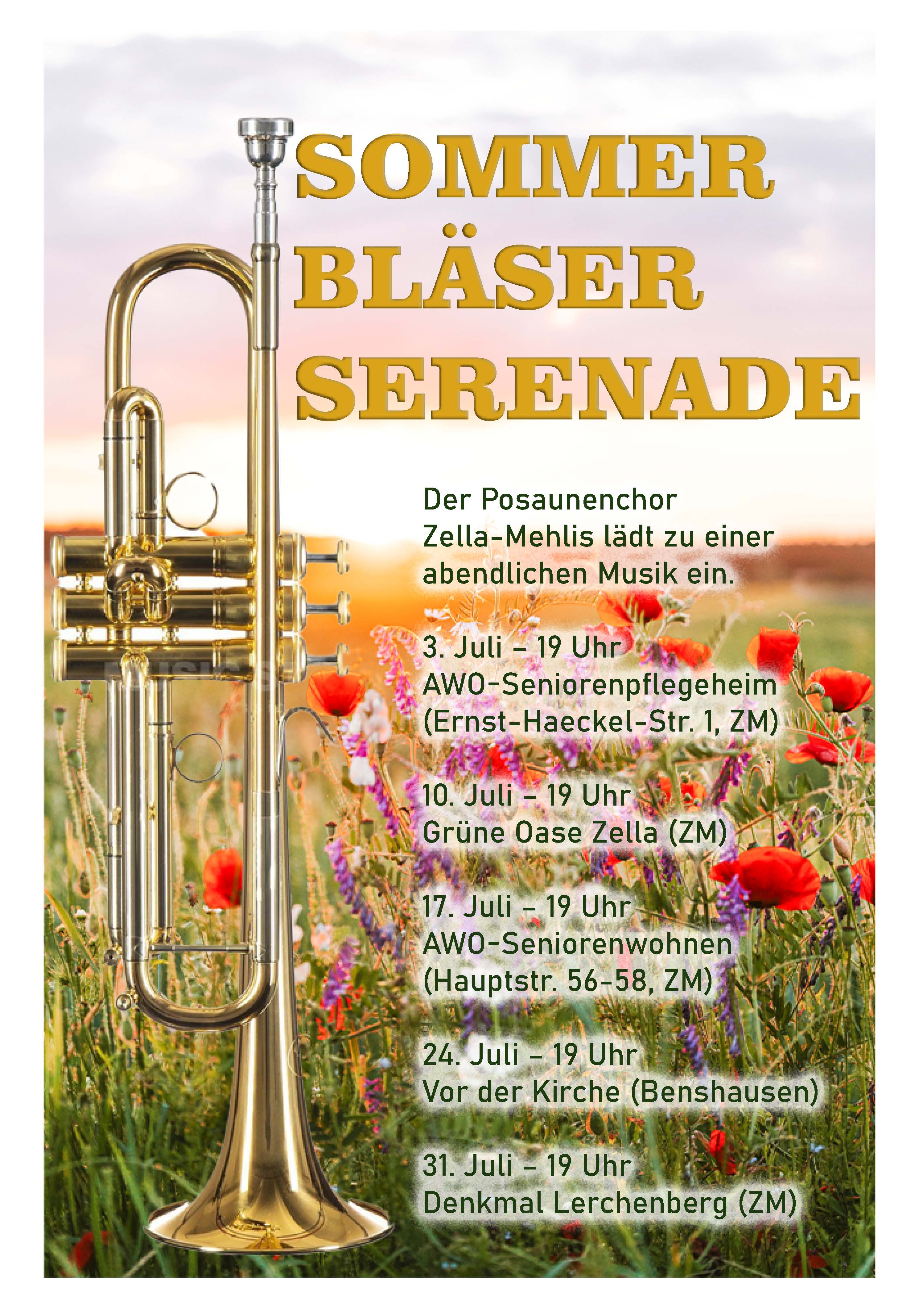 Im Juli lädt der Posaunenchor der Evangelisch-Lutherischen Kirchengemeinde Zella-Mehlis immer mittwochs um 19 Uhr zu kleinen Sommerserenaden im Freien ein. An verschiedenen Plätzen in Zella-Mehlis und Benshausen werden jeweils für knapp eine halbe Stunde Abendlieder, Choräle sowie unterhaltsame Bläsermusik erklingen.