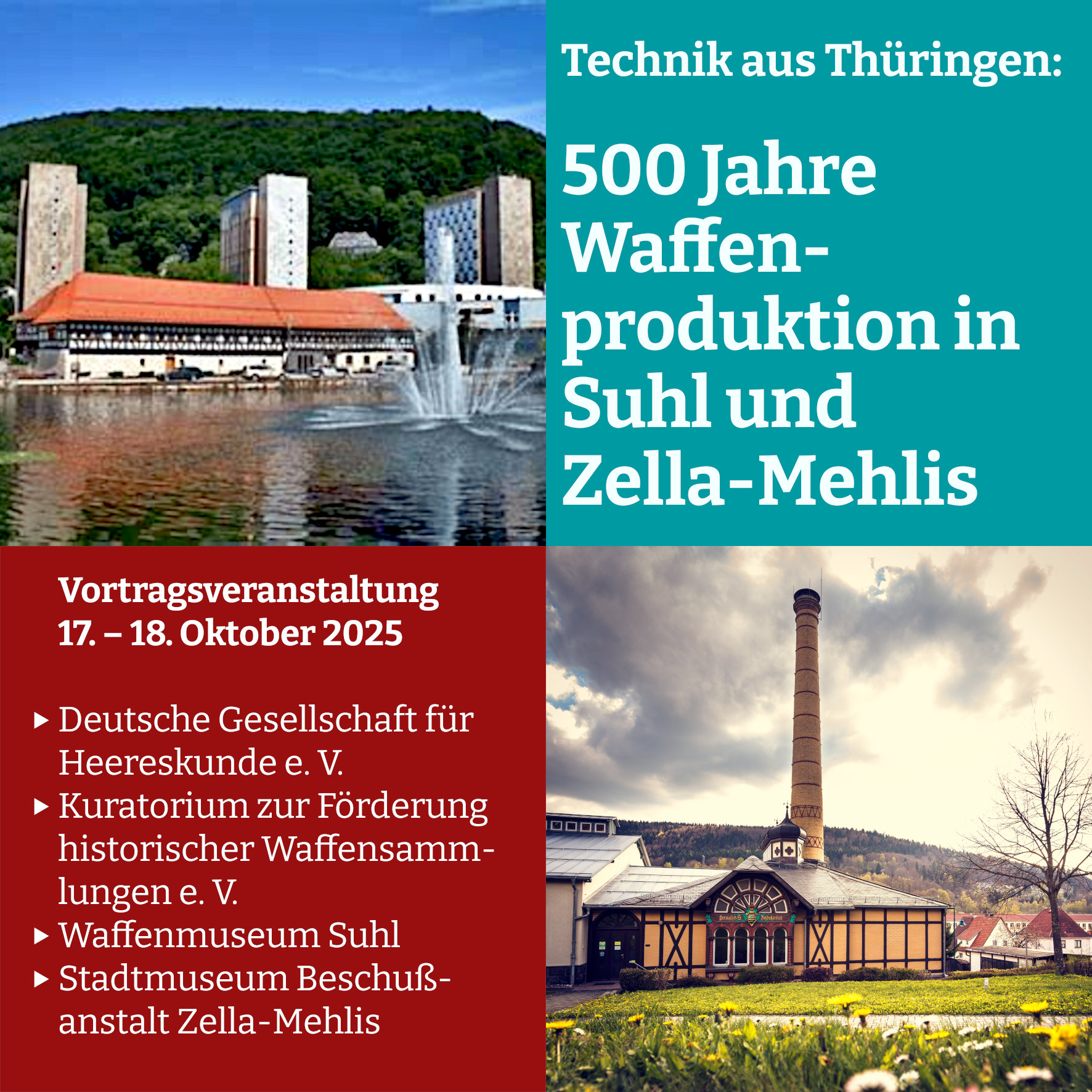 Das Stadtmuseum „Beschußanstalt“ in Zella-Mehlis ist am Samstag, 18. Oktober, Gastgeber für eine Vortragsreihe. Diese wird gemeinsam mit dem Arbeitskreis Berlin/Brandenburg der Deutschen Gesellschaft für Heereskunde e. V., dem Kuratorium zur Förderung historischer Waffensammlungen e. V. und dem Waffenmuseum Suhl organisiert. Während die Teilnehmer des Symposiums und interessierte Besucher sich bereits am Freitag im Waffenmuseum in Suhl treffen und austauschen, so finden am Samstag im Stadtmuseum in der ehemaligen Beschußanstalt mehrere Vorträge statt, die sich dem Thema „Technik aus Thüringen: 500 Jahre Waffenproduktion in Suhl und Zella-Mehlis“ widmen.