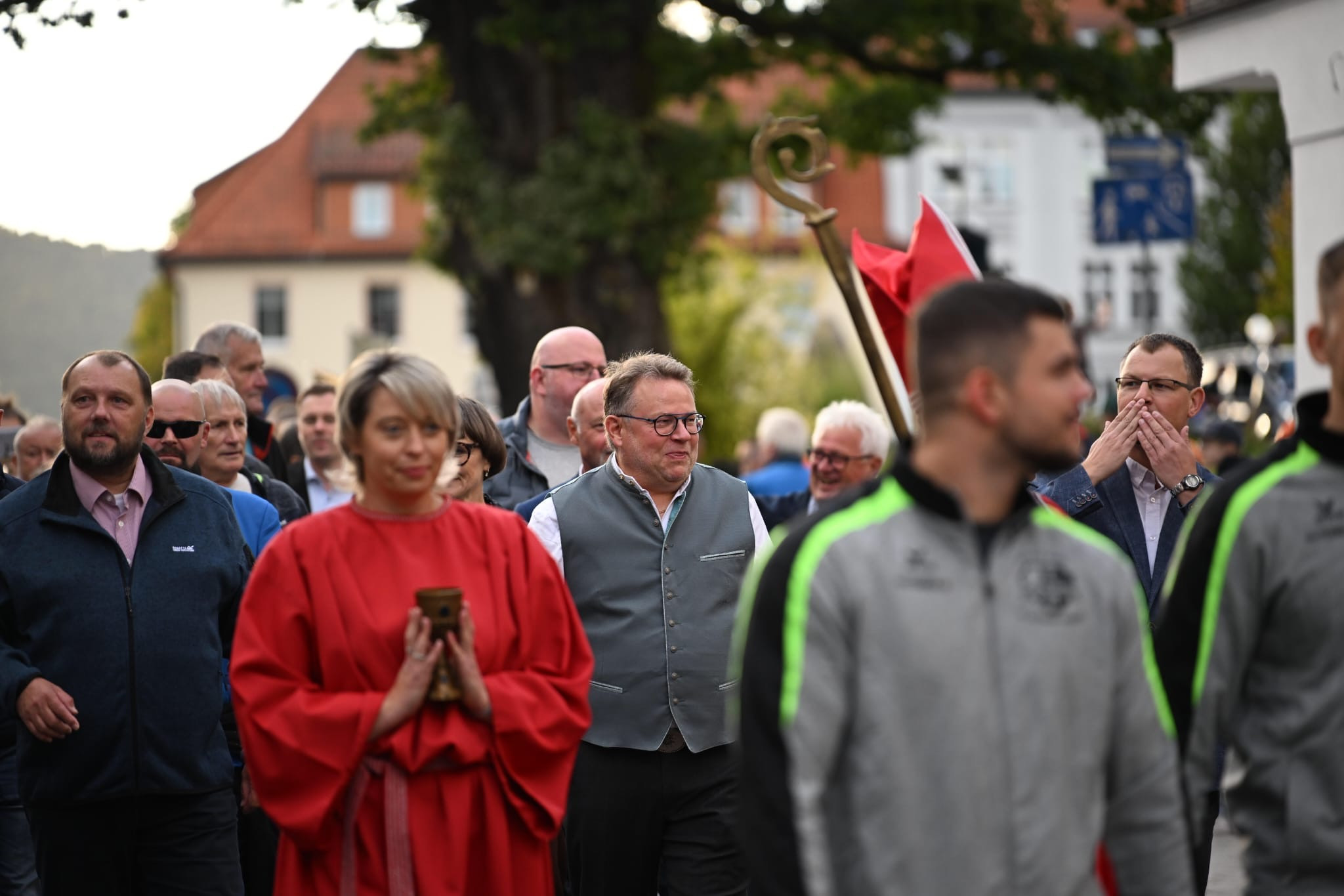 Bürgermeister Torsten Widder führte den Festumzug gemeinsam mit den Beigeordneten und natürlich den Schutzheiligen Blasius und Magdalena sowie Raubritter Ruppertus an. Auch die Vertreter befreundeter Städte, wie Marktbreit, Oberhof und Suhl, waren beim Festumzug und der anschließenden offiziellen Eröffnung im Festzelt dabei.