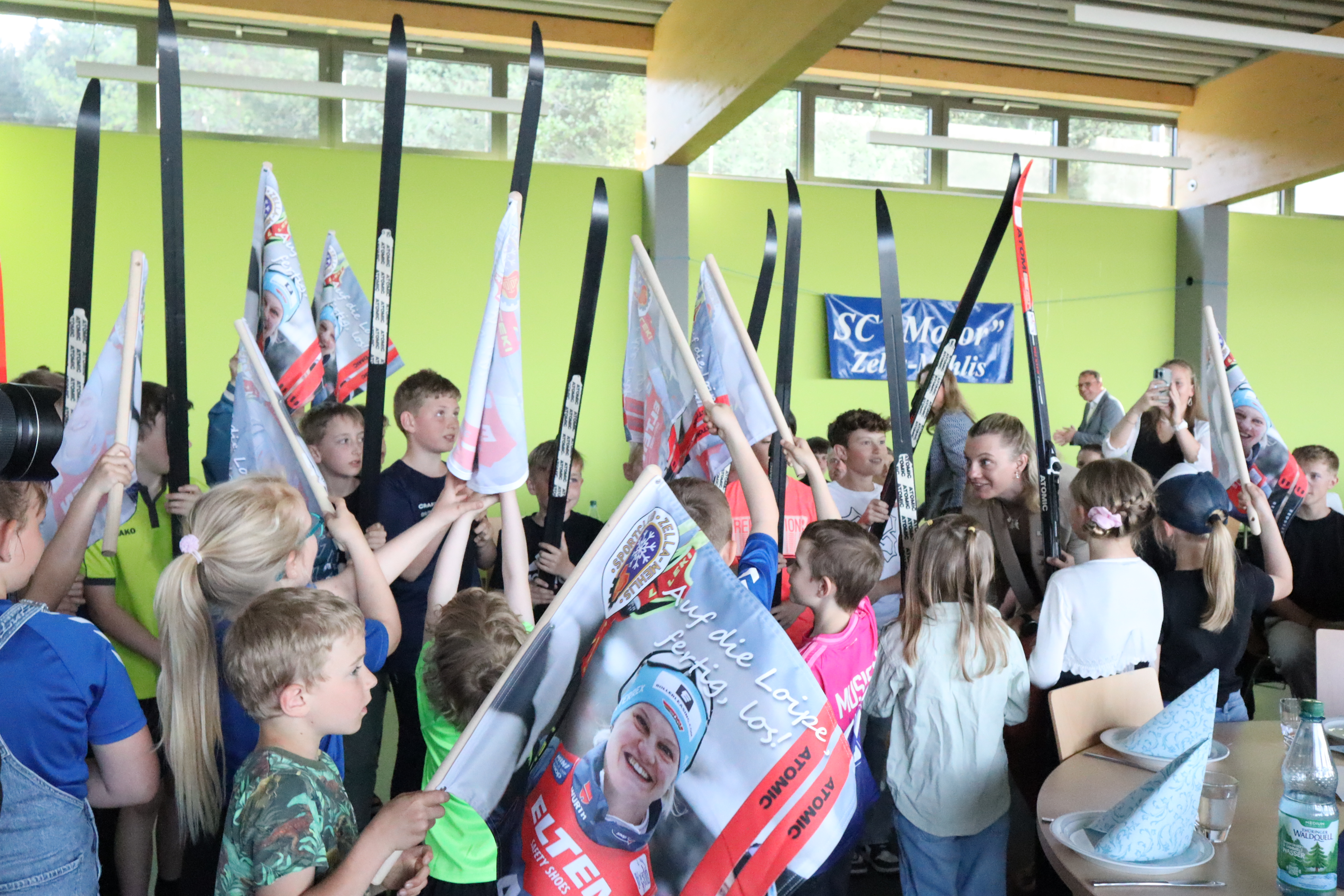 Victoria Carl musste sich kurz abducken, bevor sie am Freitagabend, 2. Mai, beim Abwintern ihres Vereins SC „Motor“ Zella-Mehlis groß auf der Bühne stand. Denn auf dem Weg dorthin standen die jungen Nachwuchssportler mit Skiern und Fahnen Spalier und hatten der erfolgreichen Skilangläuferin den Weg gewiesen. Auf der Bühne war alles vorbereitet: Victoria Carl trug sich anlässlich ihrer sportlichen Erfolge in der zurückliegenden Weltcup-Saison in das Goldene Buch der Stadt ein.