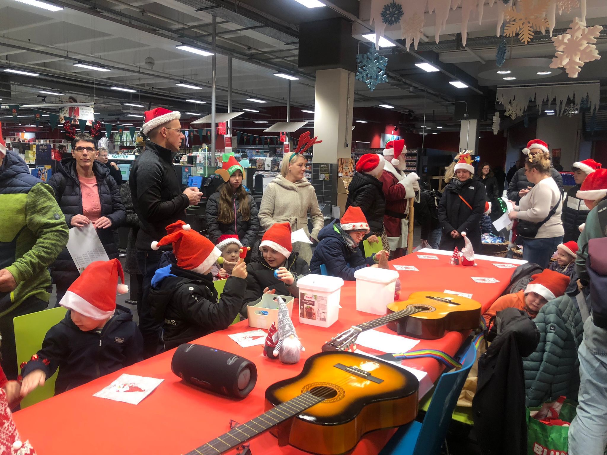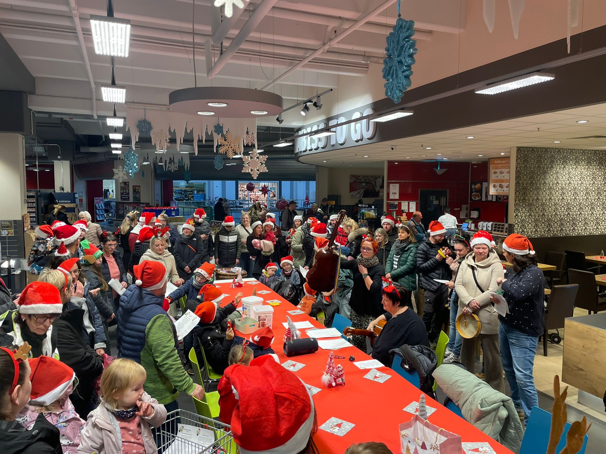 Insgesamt 50 verkleidete große und kleine Helfer kamen in den Rewe-Markt und sangen vor Ort drei Weihnachtslieder. "Der Weihnachtsmann geht um den Kreis", "Schneeflocken hüpfen" sowie "Lasst uns froh und munter sein" gehörten zu den Klassikern, die erklungen. Auf Wunsch der Kinder wurde noch ein weiteres Lied gesungen: Der Internetsong "Gute Laune!!".
