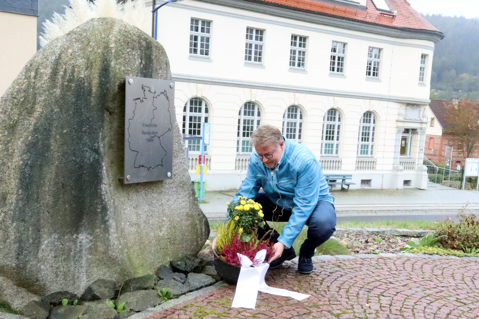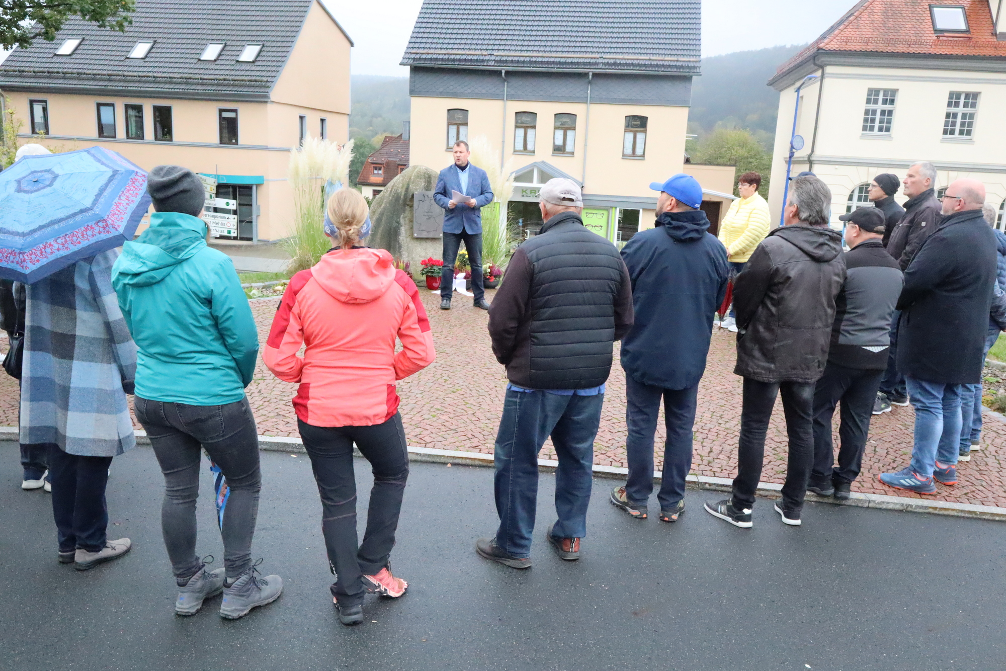 Auf Einladung der Fraktion Freie Wähler Zella-Mehlis sind Bürgermeister Torsten Widder, Vertreter mehrerer Stadtratsfraktionen, frühere Stadtratsmitglieder und andere Interessierte auf den Rathausplatz gekommen und haben sich am Gedenkstein versammelt. Thomas Bischof, Erster Beigeordneter des Bürgermeisters und Mitglied der Fraktion der Freien Wähler, hielt die Ansprache. Er stellte zunächst fest, dass die Deutschen im Vergleich zu den Franzosen oder den Amerikanern beispielsweise nüchtern-rational ihren Nationalfeiertag begehen.