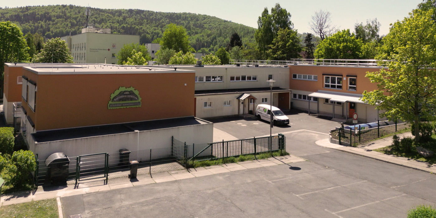 Unsere Einrichtung ist ruhig, am Rand eines Wohngebietes gelegen. Wir haben nur einen kurzen Wegen in die Natur und zu weiteren städtischen Spiel- und Sportanlagen.